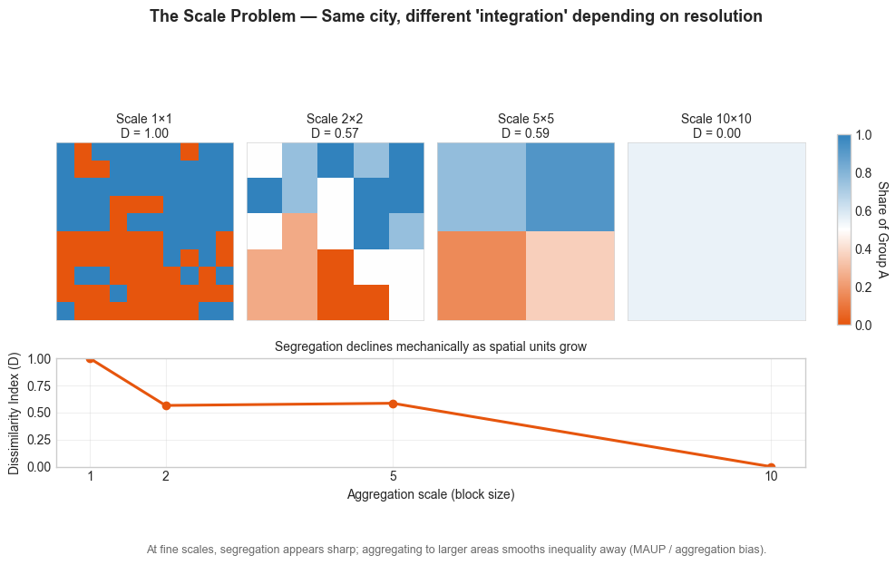 Segregation depends on the spatial scale you choose. A city can look integrated at the regional level and deeply segregated at the block level. Sociologists call this the modifiable areal unit problem (MAUP). Economists call it “aggregation bias.” It’s the same mathematical sin - we pretend one spatial scale fits all.