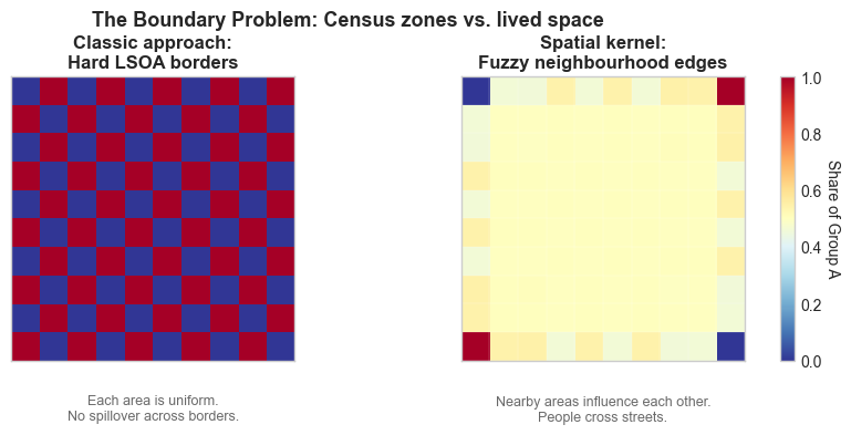 Census areas are administrative, not lived. The Dissimilarity Index assumes impermeable borders: you either live in one LSOA or another, no middle ground. Yet real life is fuzzy - people cross streets, commute, and mingle. Geographers like O’Sullivan & Wong (2007) proposed spatial kernels that weight nearby neighbourhoods by distance, smoothing sharp boundaries. Economists rarely adopt this because it complicates inference - but the result is that we’re still modelling social life as a checkerboard.