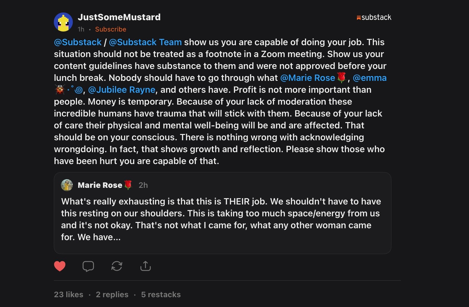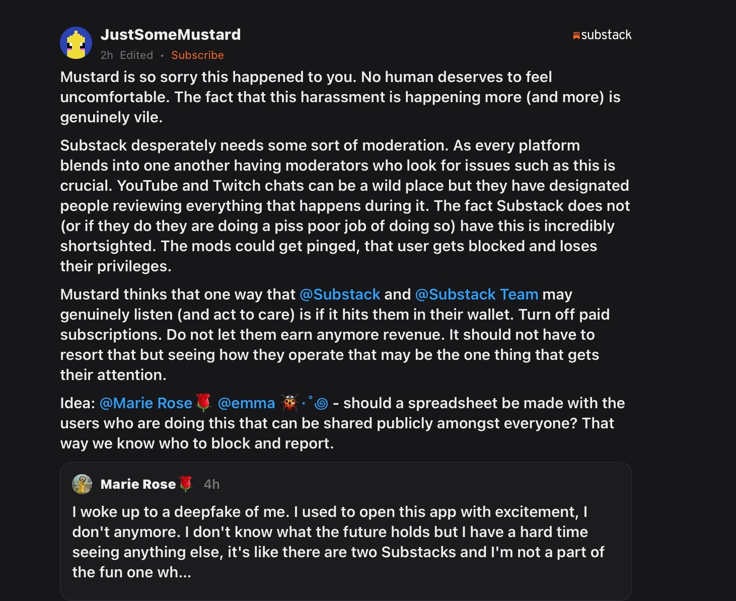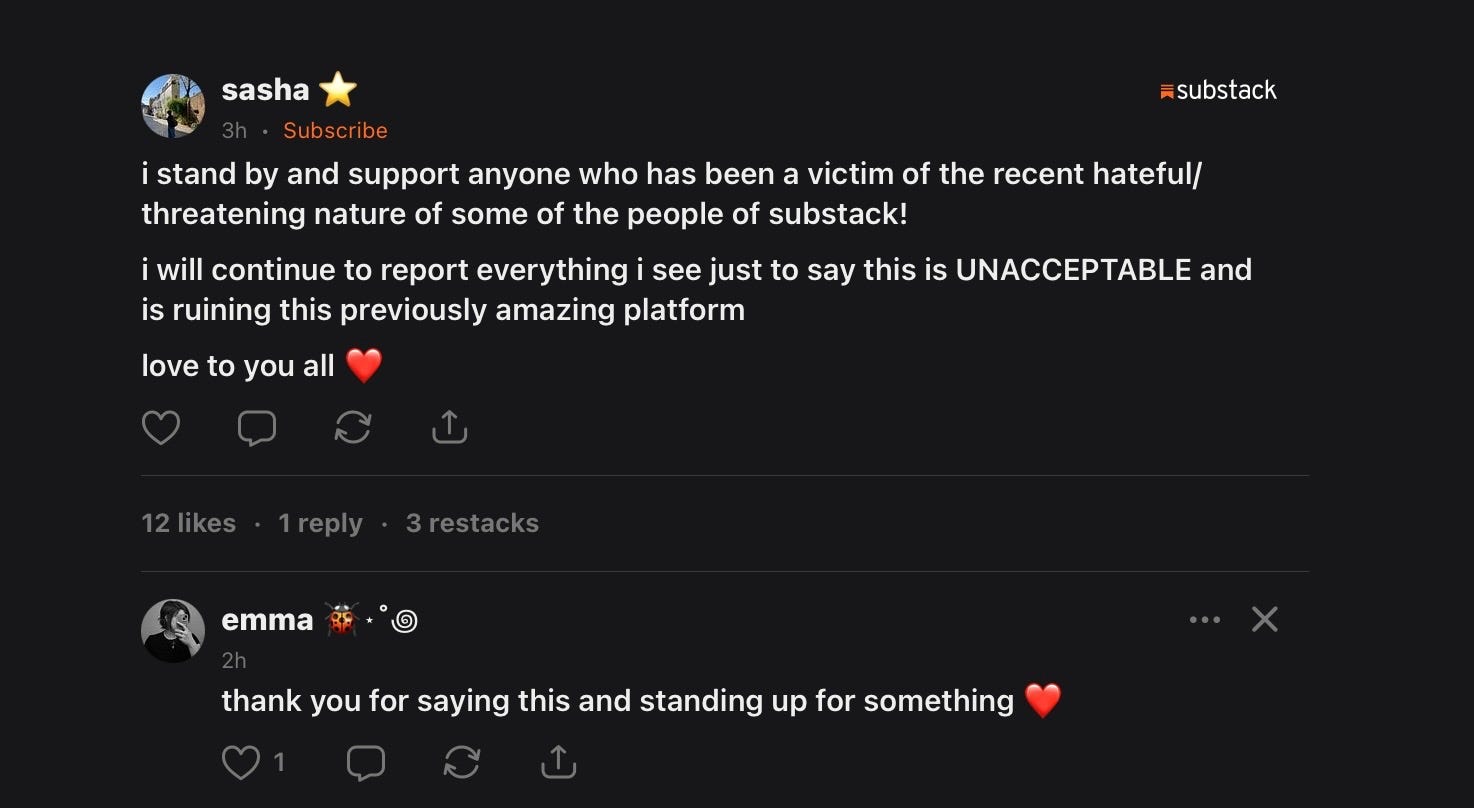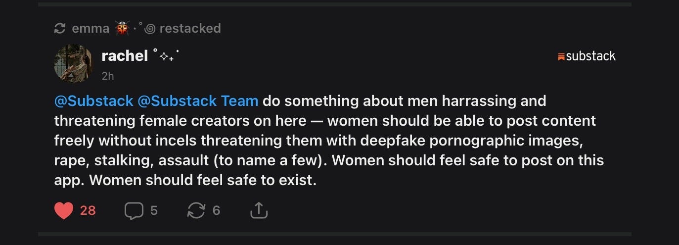 For most, if not all of us, Substack has been a “safe” corner of the internet but that illusion has been taken by men who view the racially and sexually derogative language towards us as normal. Not only is it normal to them, they feed off of it. We can only handle so much as independent creators and this abuse has gone on far too long and hits on such sensitive topics. Vile language around loved ones who have passed away, the threat of deepfake pornography creation, racial slurs.