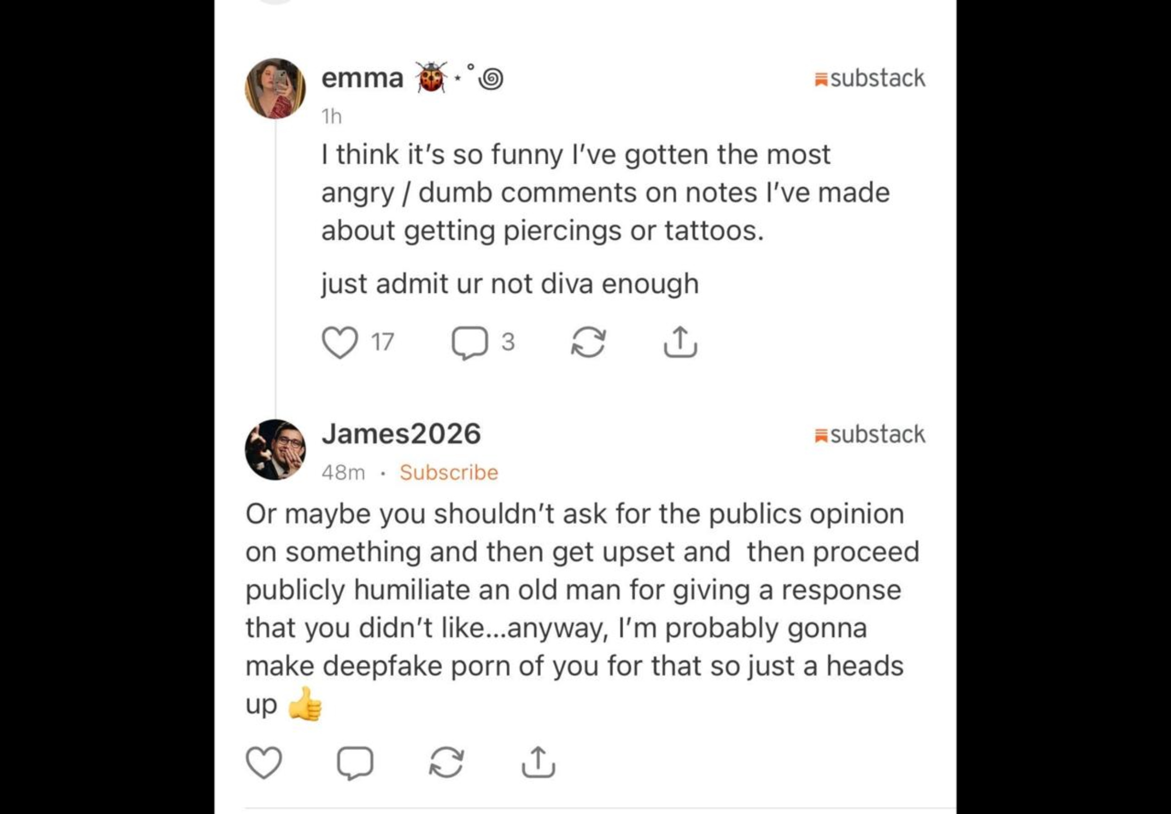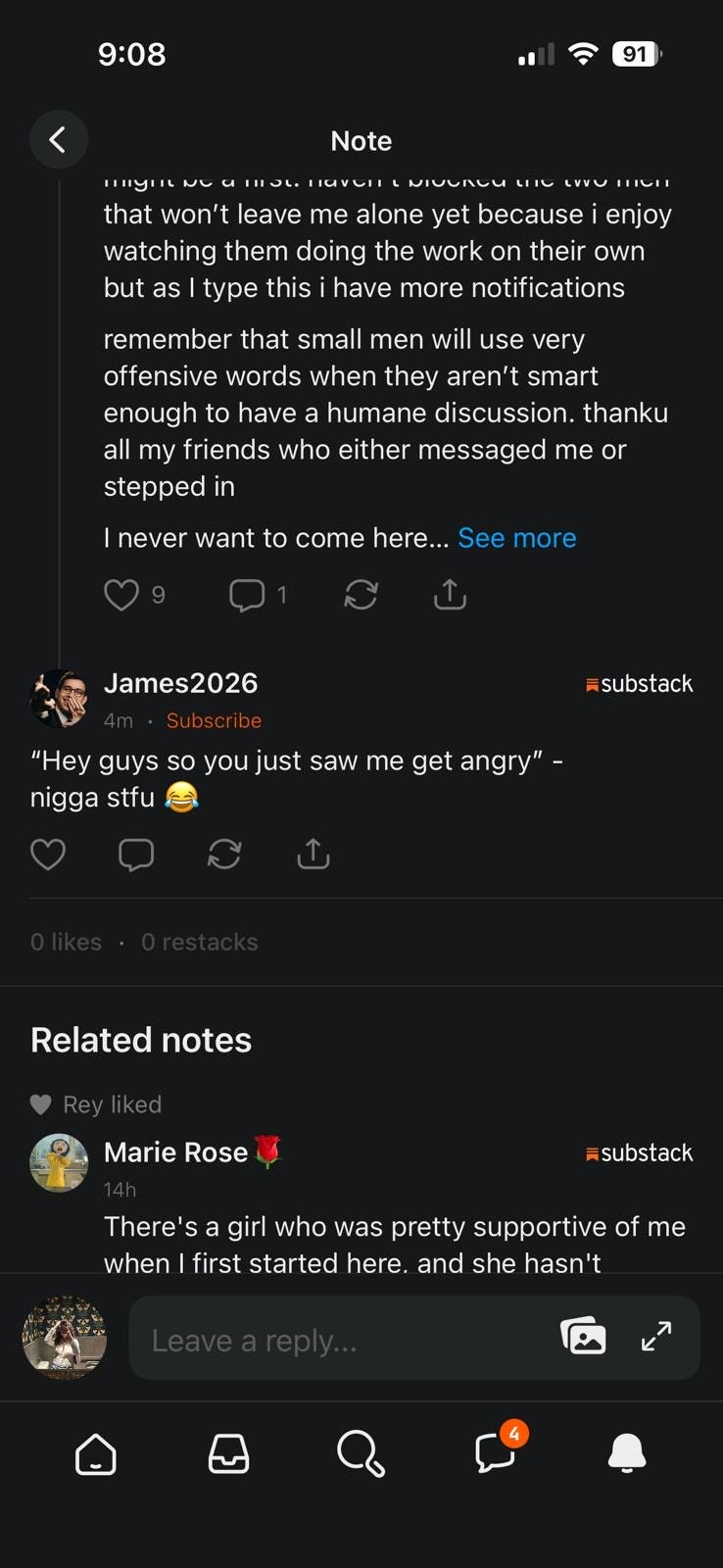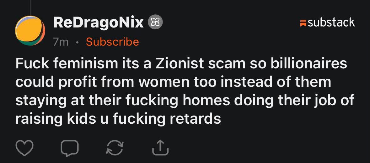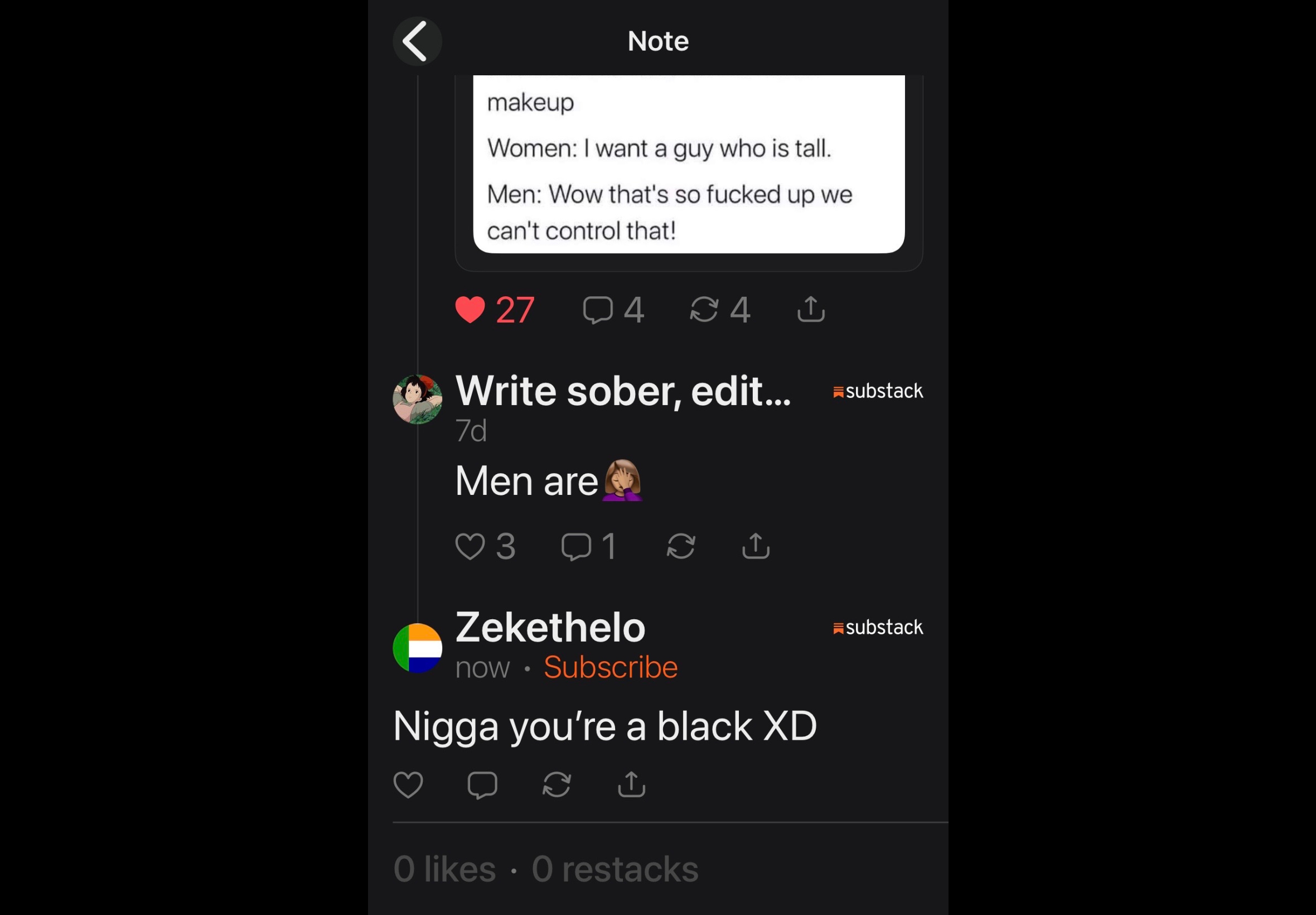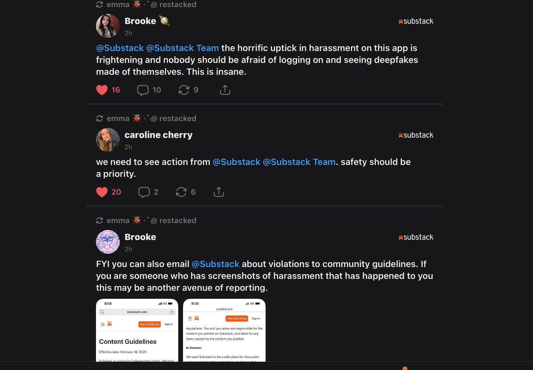 For most, if not all of us, Substack has been a “safe” corner of the internet but that illusion has been taken by men who view the racially and sexually derogative language towards us as normal. Not only is it normal to them, they feed off of it. We can only handle so much as independent creators and this abuse has gone on far too long and hits on such sensitive topics. Vile language around loved ones who have passed away, the threat of deepfake pornography creation, racial slurs.