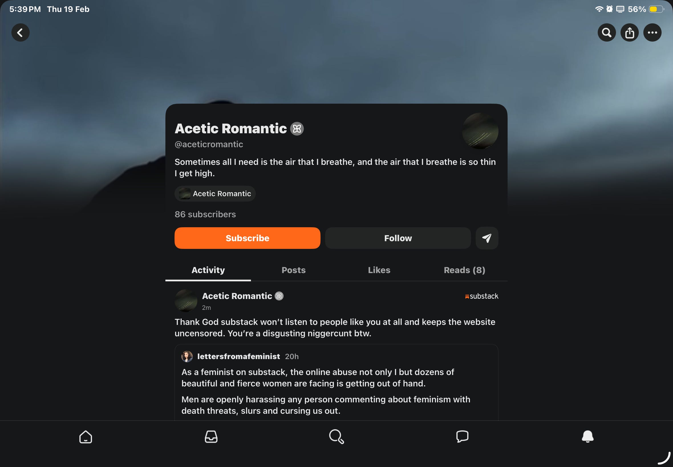 Many of the recent troll accounts targeting women on Substack have been doing exactly that: rape threats on the basis of sex, race, using racial slurs, ableist slurs and misogynistic slurs.