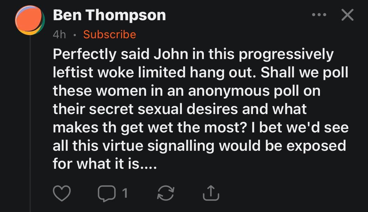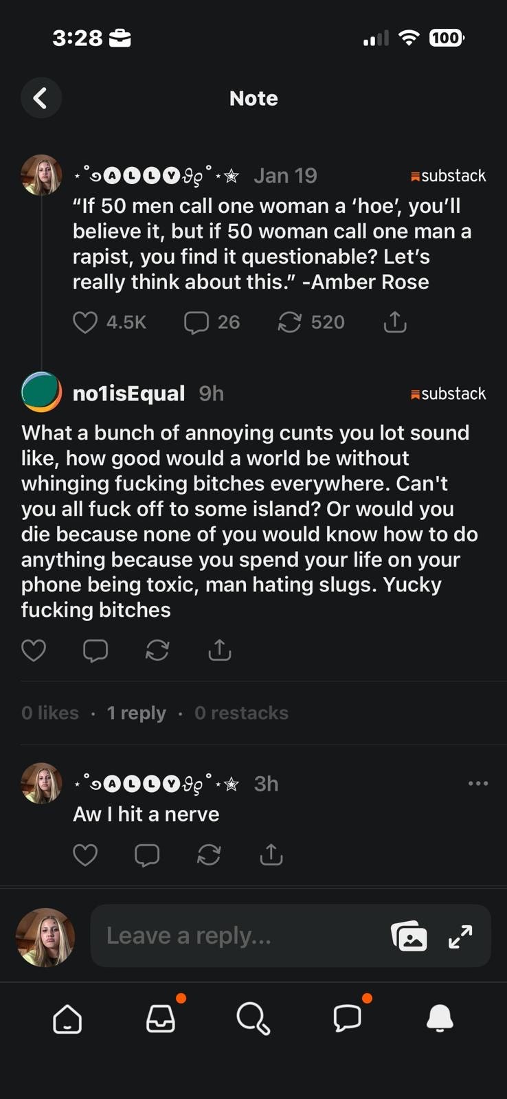 Over the past few days alone, I have encountered multiple abusive comments directed at myself and other users. I have attached screenshots of several examples. These accounts clearly violate Substack’s Terms of Use, yet they remain active. Many of these accounts are newly created, anonymous, and appear to exist solely to harass women.