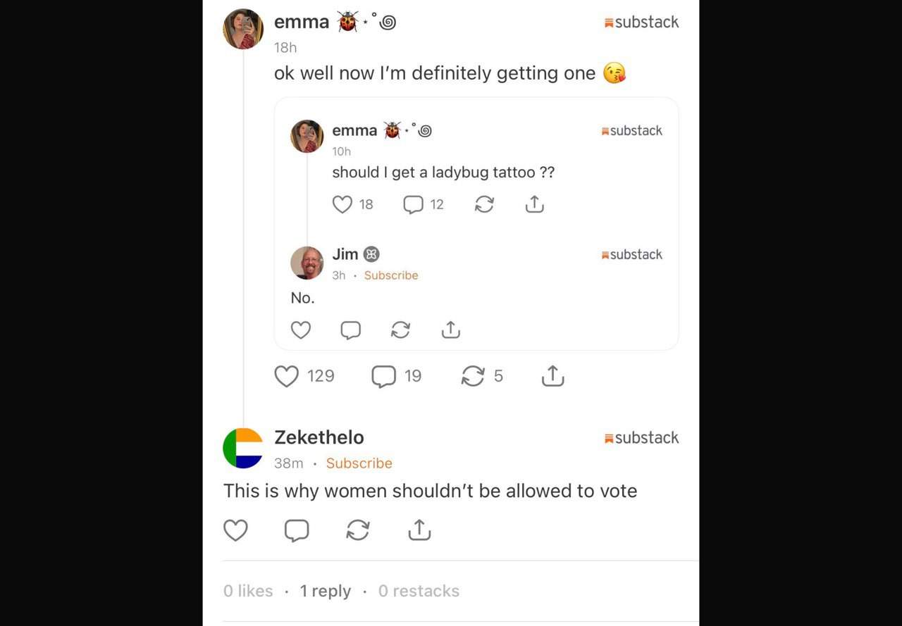 Substack also needs to introduce stronger user-side safety settings. For example, the ability to automatically block certain words from comments, or to prevent brand-new accounts from commenting at all. If an account is one day old, has no followers, and isn’t following anyone, they shouldn’t be able to comment or at the very least, they shouldn’t be able to comment without the user’s explicit approval.