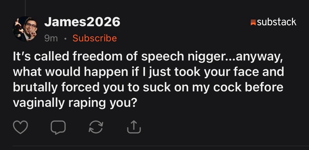 And even if we hadn’t blocked them, that still wouldn’t justify racial abuse or rape and death threats. Even if they’re “just bots” or “just trolls”, we don’t want to be racially abused or threatened online. How is that hard to understand? We don’t care who’s behind it or why - it’s unpleasant, unwarranted, and a clear violation of Substack / Substack Team Content Guidelines and Terms of Use.