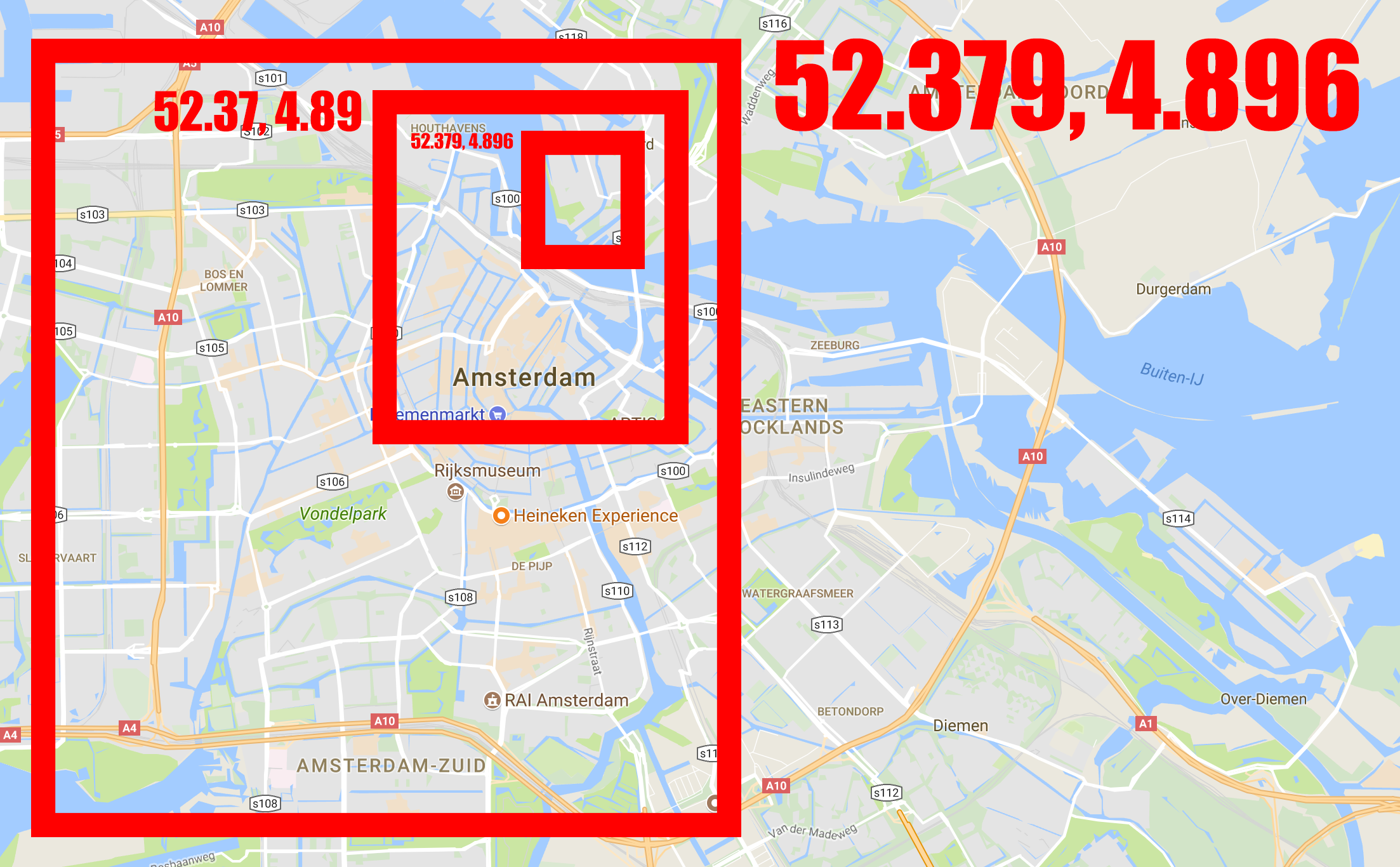 I thought for a while how to fix this. I could cover the earth in my own grid of dots that would specify areas. But all this stuff seemed way too hard and meanwhile there was 100 people watching on the stream waiting for me to fix this ASAP. So I thought of a super trick: I just remove some decimals from the coordinates. So (52.37029884,4.8930113243) became (52.370,4.893), even further (52.37,4.89) and then (52.3,4.8). With every decimal removed you have an area about 10x more that it covers, see: