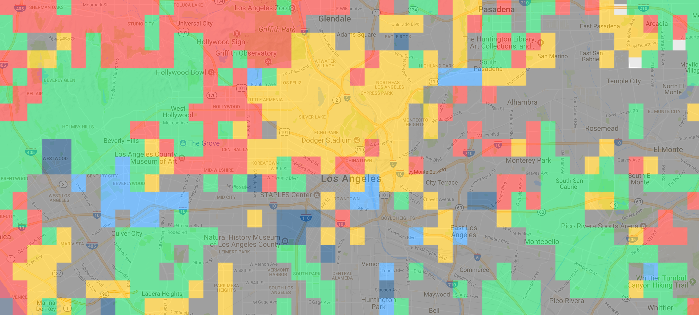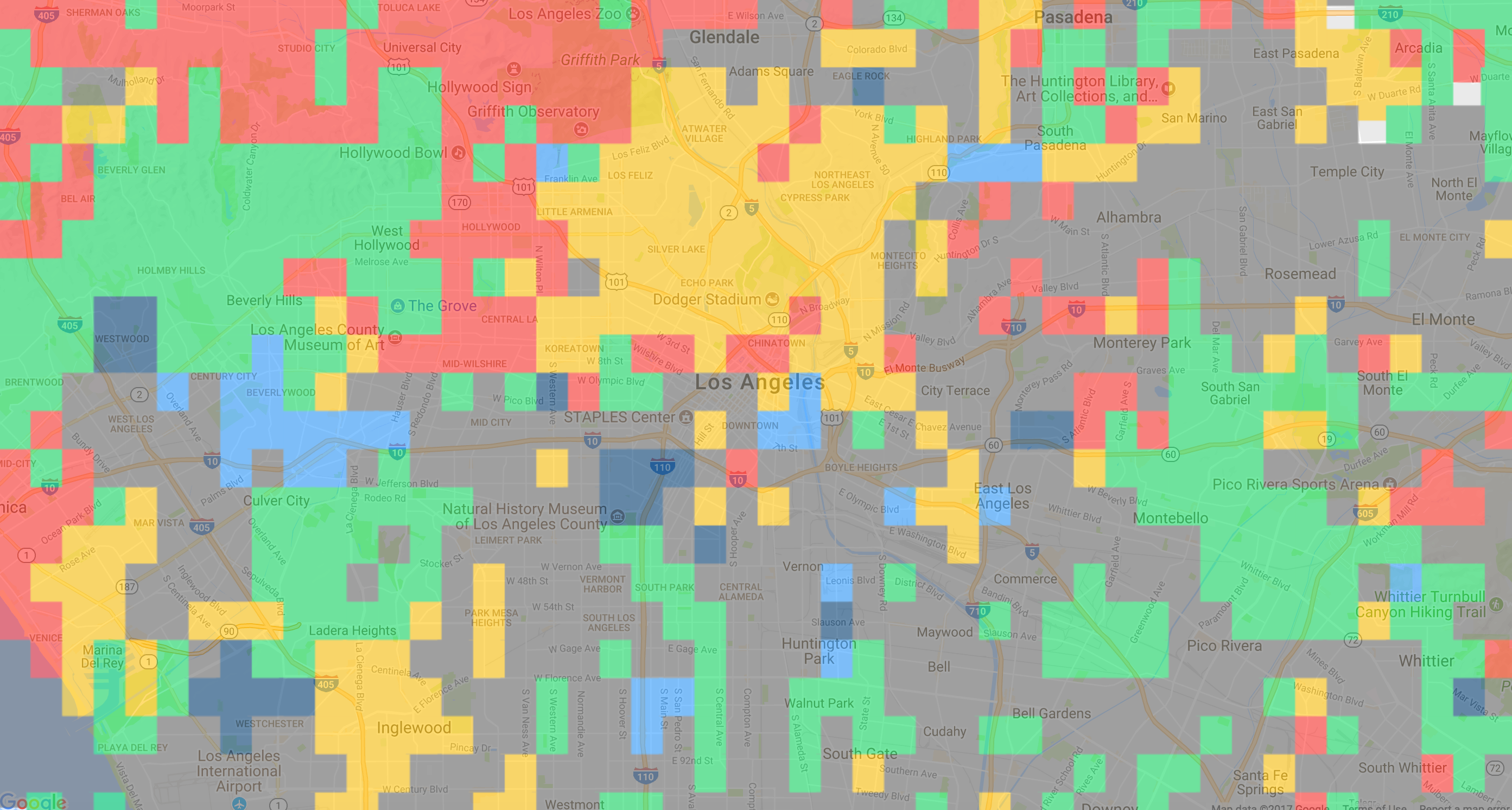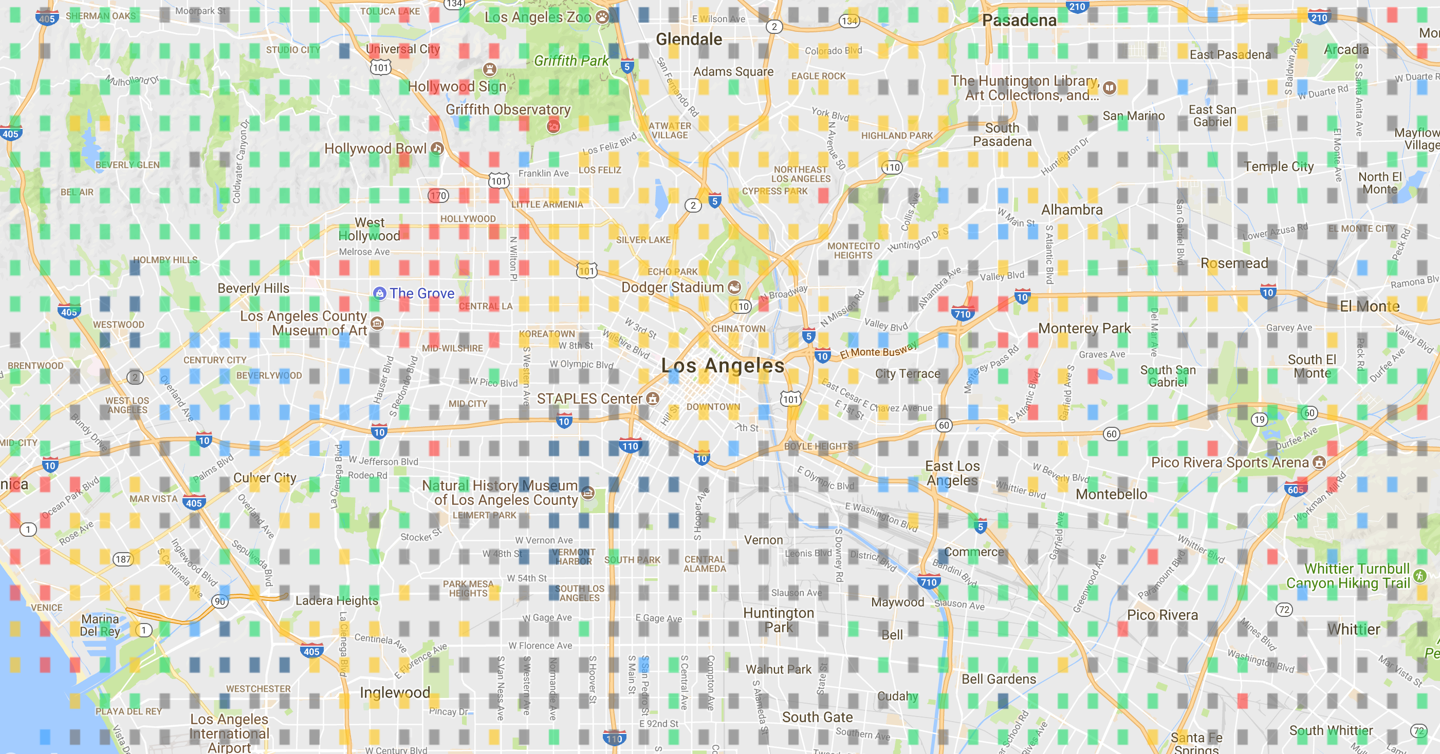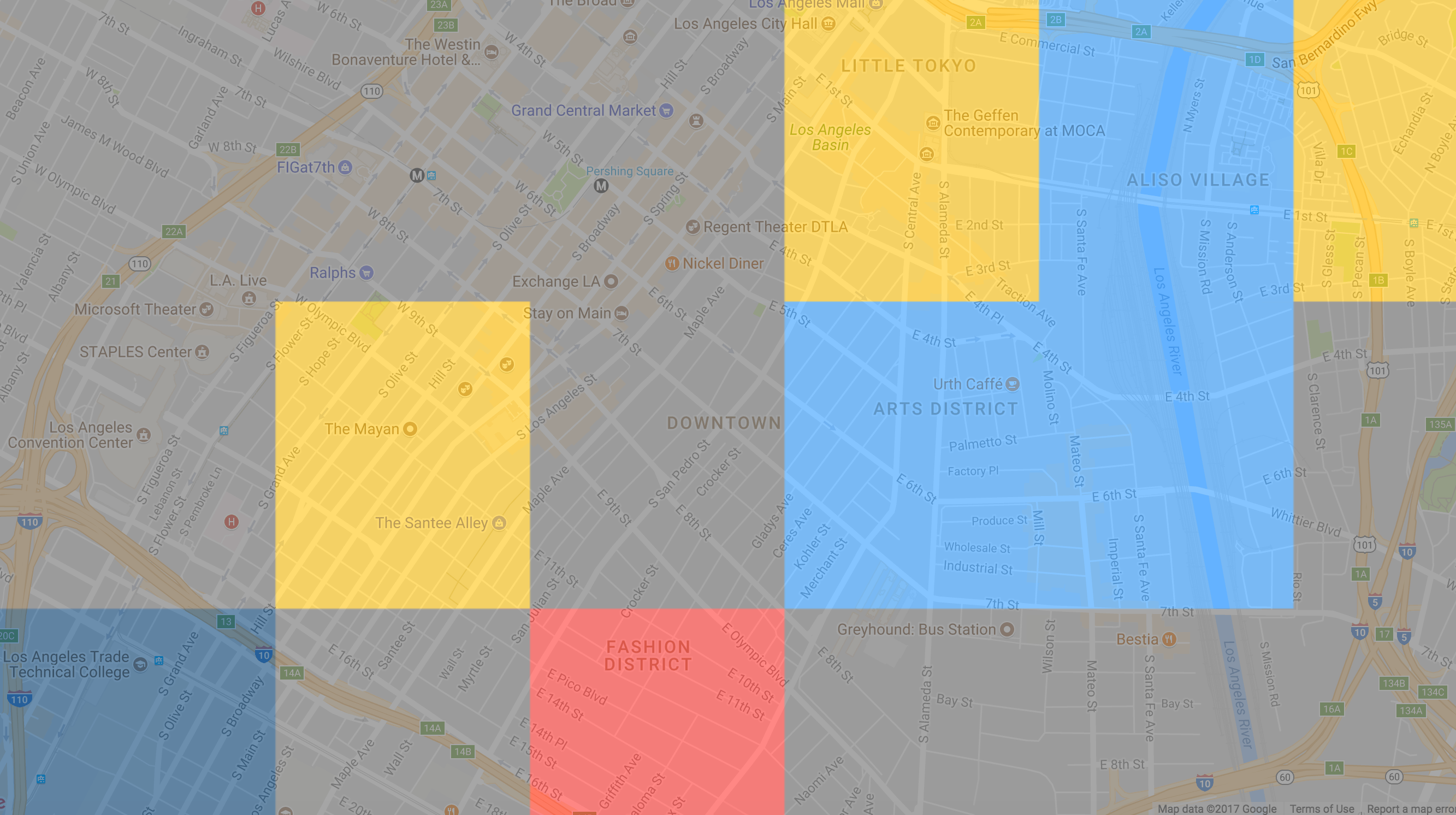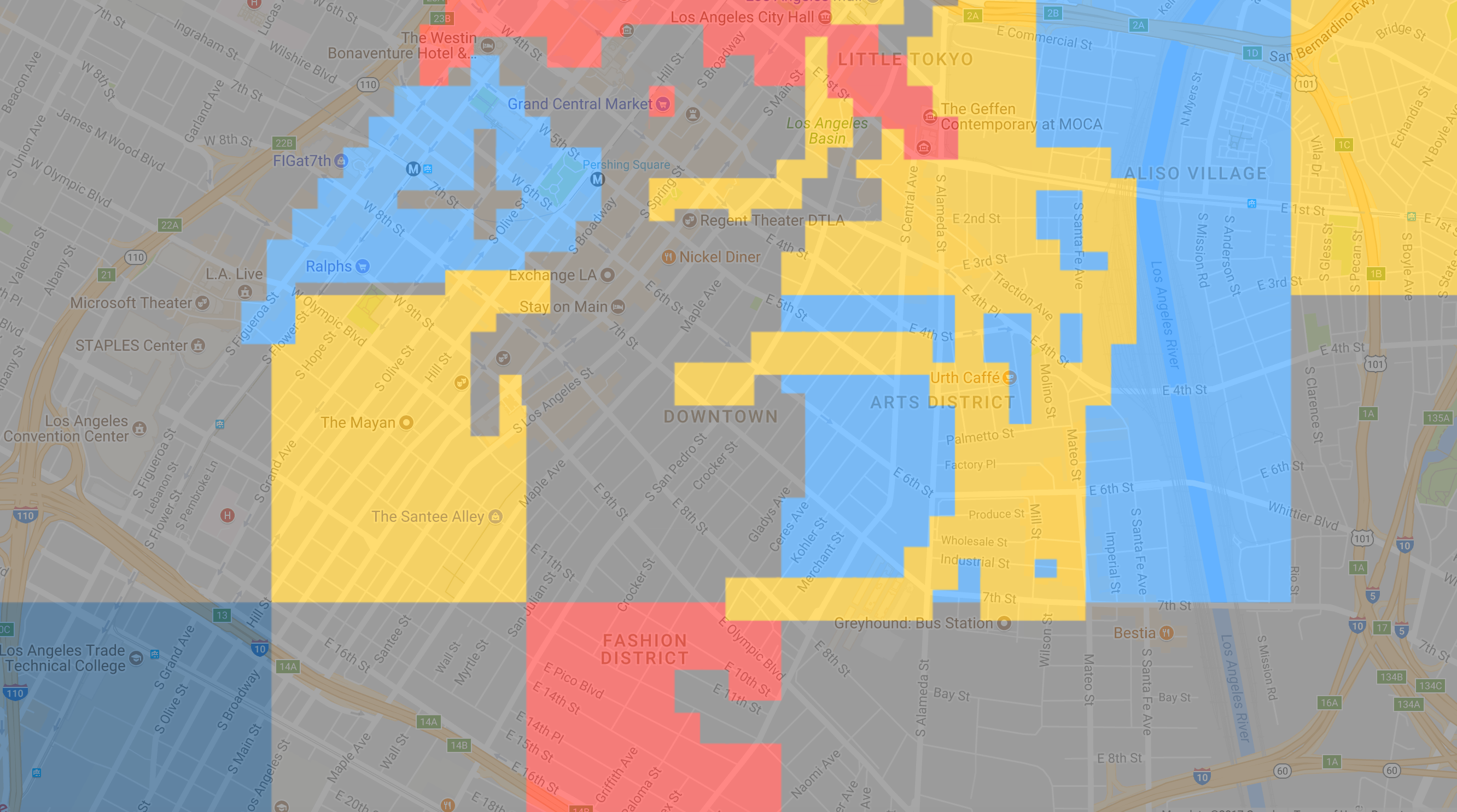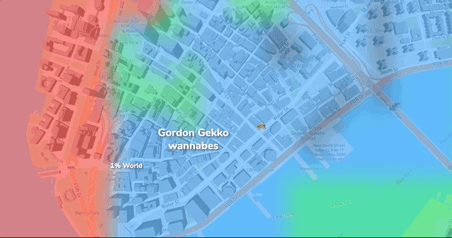 That means you’ll see an entire area be yellow on zoom out, but when you zoom in, you’ll see it with a backdrop of yellow but specific detailed colors added. For example the area is yellow (hipster) but that one street is blue (business). This gives dynamic detail without messing up the big overview of the city when zoomed out!