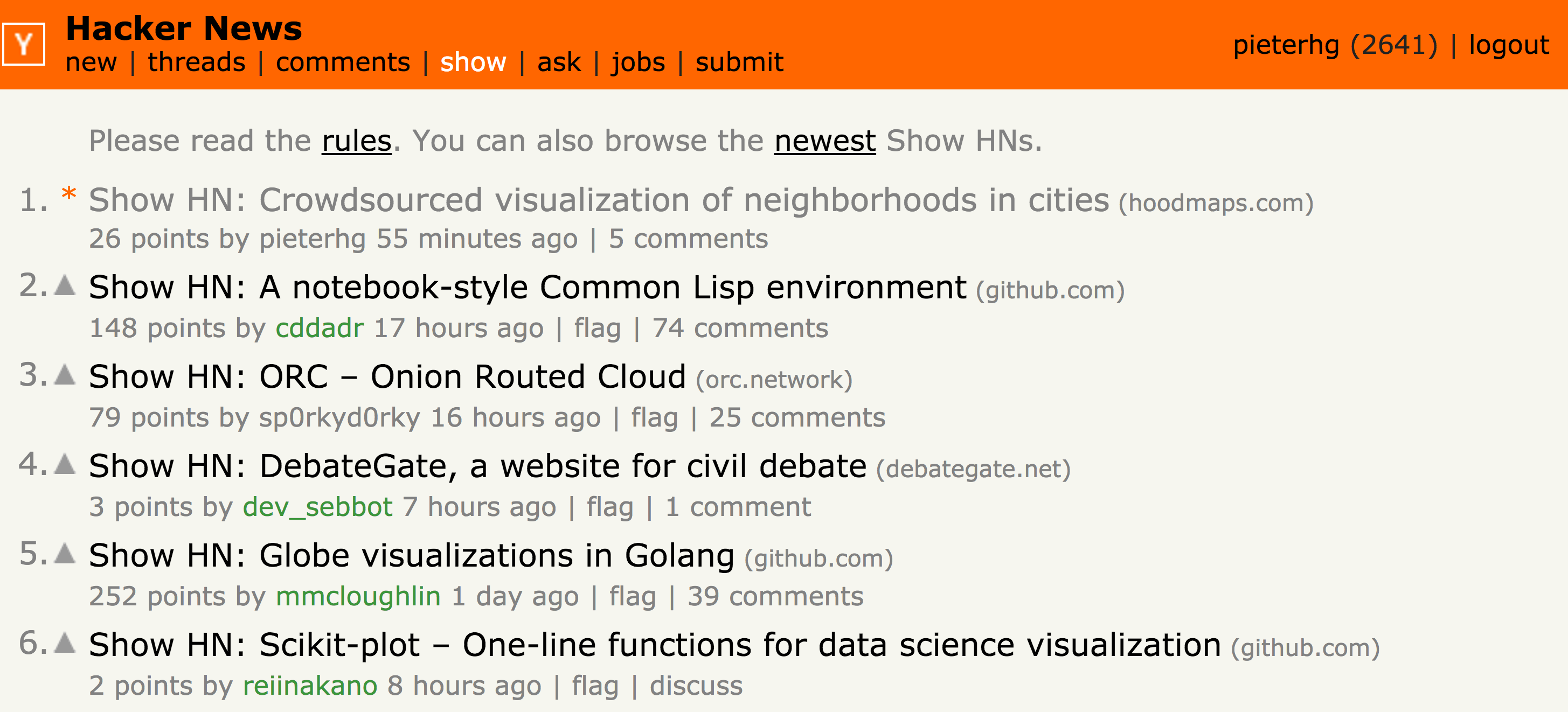 Instead of posting on the main board, which I could, I tried Show HN: which is like a showcase board for when you made something on Hacker News. Less competition and more odds to get on top. A highly upvoted Show HN: also has the chance to get to the frontpage.