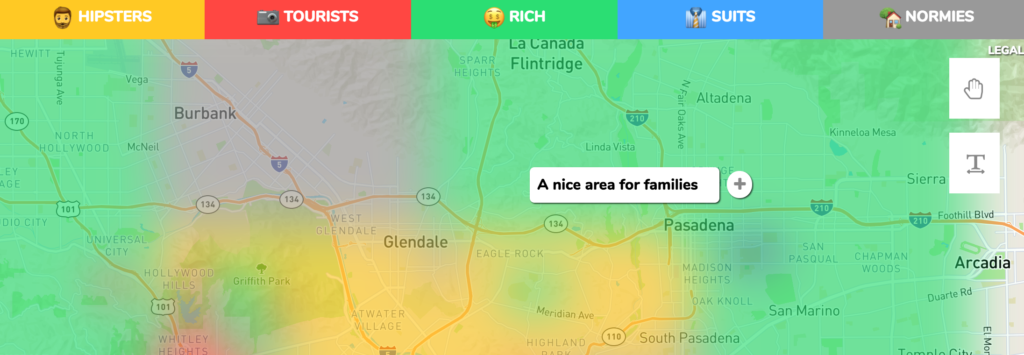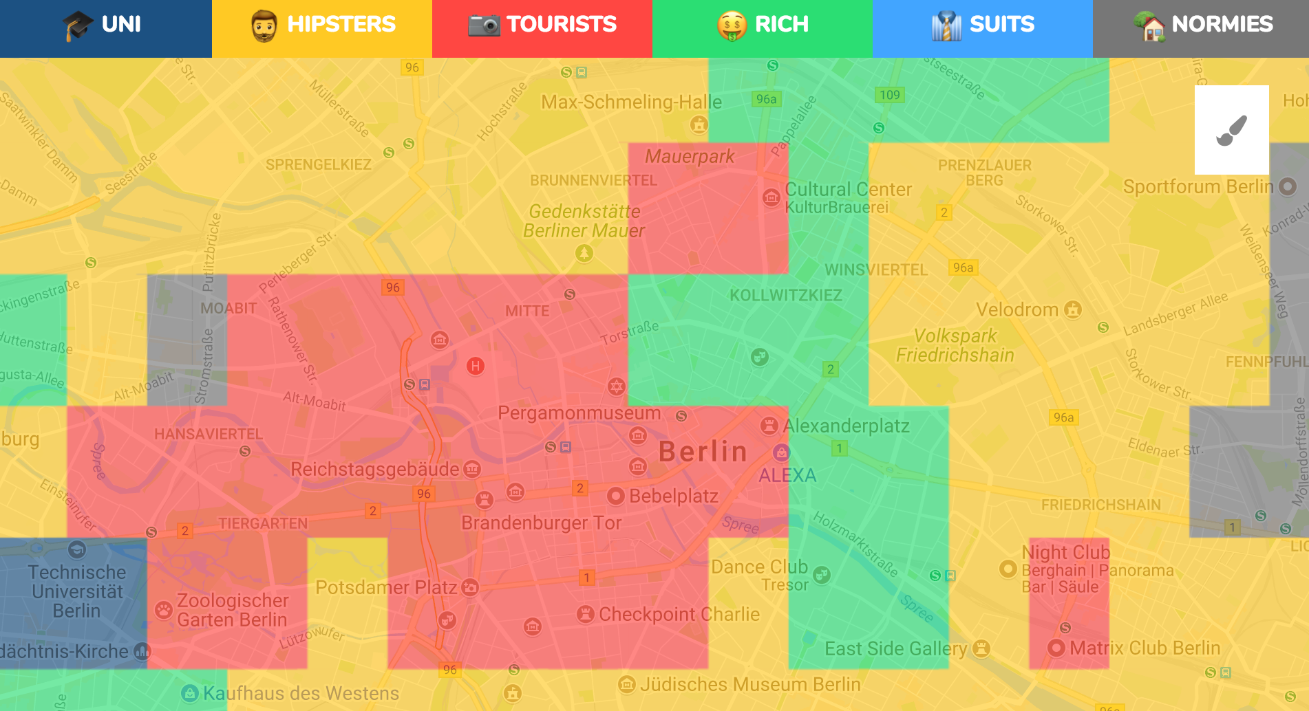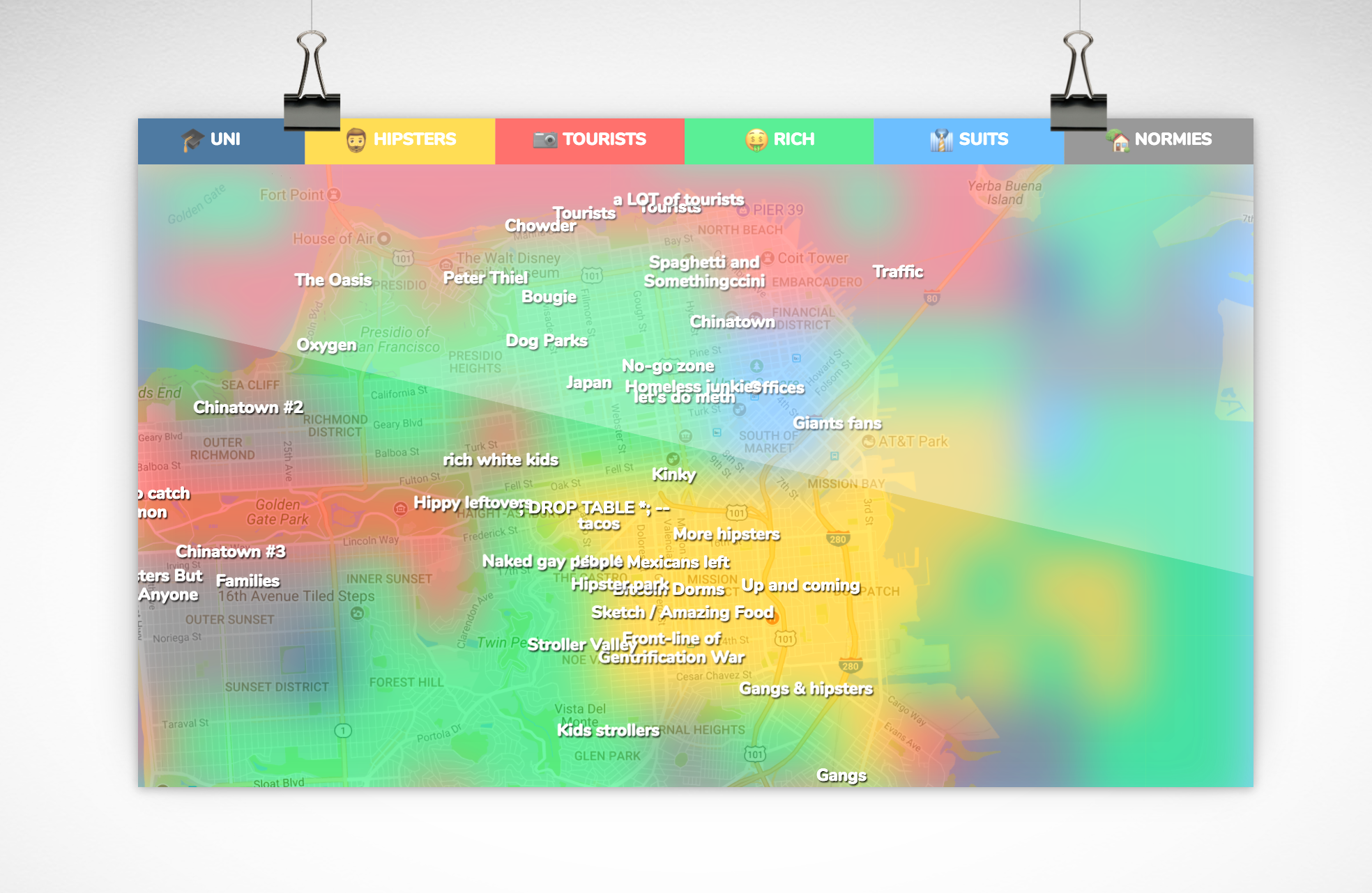 But what if I could build this in a web app where I could draw over a map myself with different colors representing different categories. Every color people draw would represent a different category. I’d have hipster, tourist, wealthy, suburb, business and student area colors. What if I could average everybody’s drawings and show that? Like crowdsourced, would that work? So if 5 people draw over an area that it’s tourist, but 8 draw over it that it’s hipster, it’ll show up as hipster?