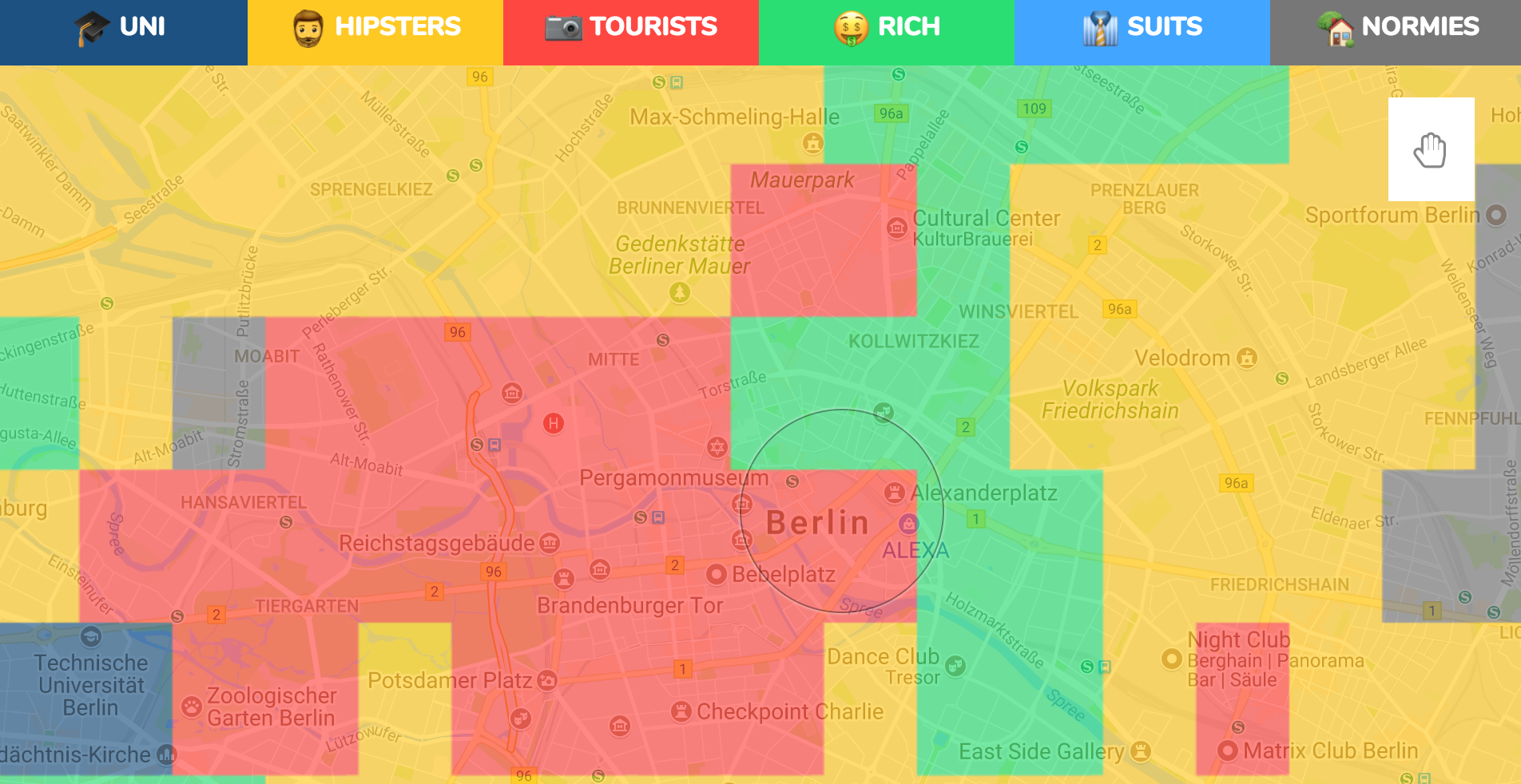 [52.37029884,4.8930113243] : [‘hipsters’,’suits’,’normies’,’normies’,’normies’,’hipsters’,’uni’,’hipsters’,’uni’,’hipsters’]
