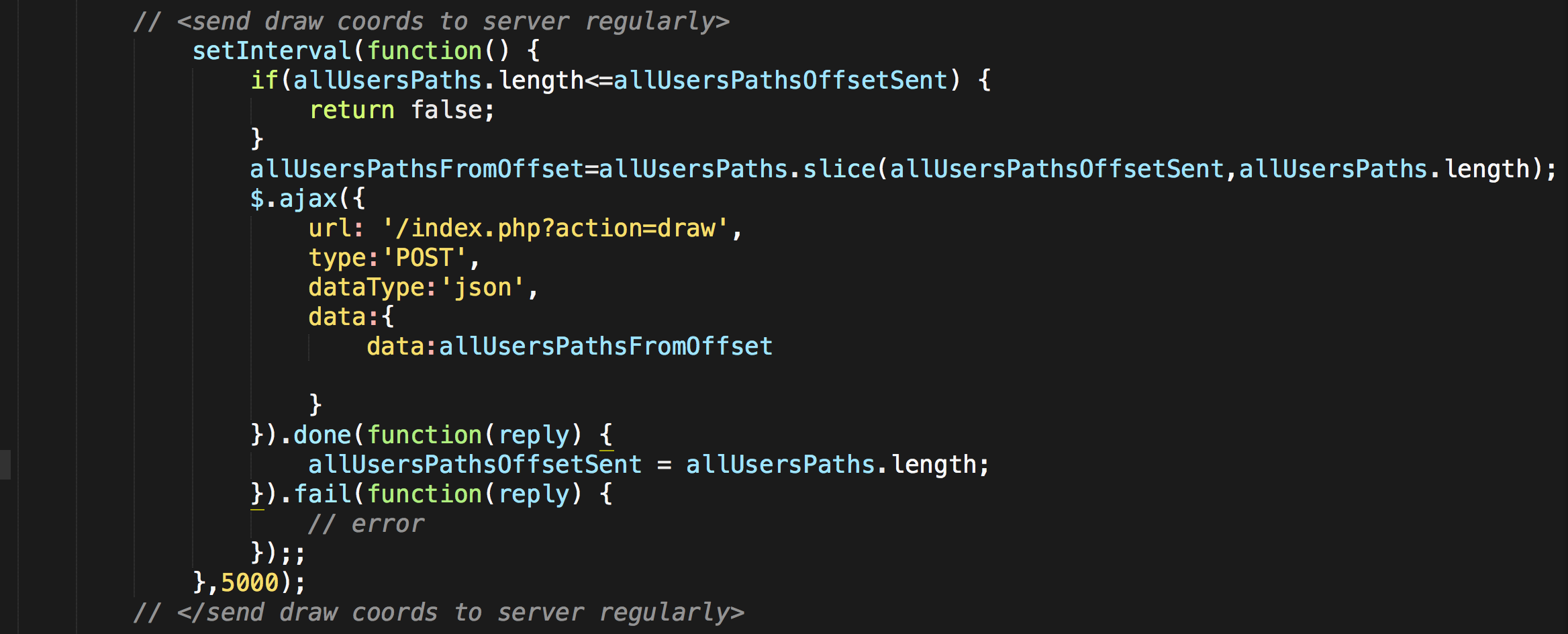 I do an AJAX call to a PHP script on the server (which is simply the same script but /index.php?action=draw behind it) with the drawings. I didn’t want to overload the server, so I buffer the drawings and then do a setTimeout() timer to send them to the server every 5 seconds: