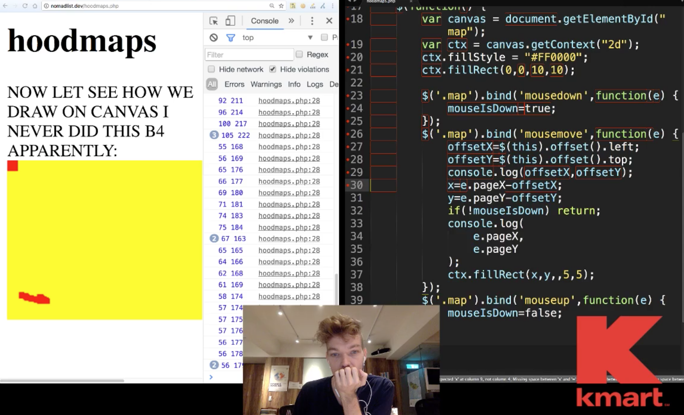 As seen in the video, I started with just a basic canvas. Canvas is a cool relatively new HTML tag that lets you make a square white box that you can draw in with JavaScript. You can literally do anything you can think off in Photoshop in HTML now with Canvas tags and some JS code. I never used it before, so I was a bit scared. But I tried: