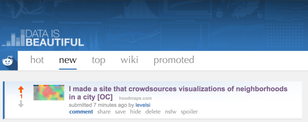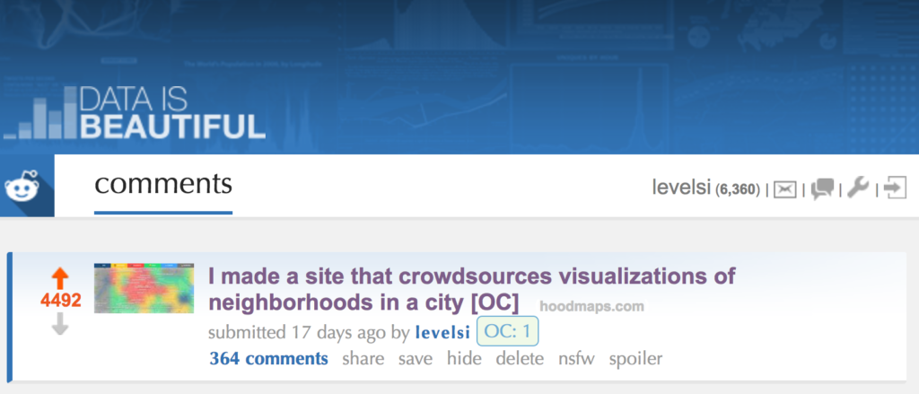 Obviously, the goal was to get to the frontpage. But I never expected that would actually happen. I had it happen ONCE before submitting Nomad List to /r/dataisbeautiful: 2 years ago on /r/dataisbeautiful. The comments were quite critical but it reached the frontpage. With previous success, and Hoodmaps also being a relevant site for the subrreddit /r/dataisbeautiful since it’s also data based (and beautiful), I submitted it. I needed to be SPOT ON with the title here or it’d die.