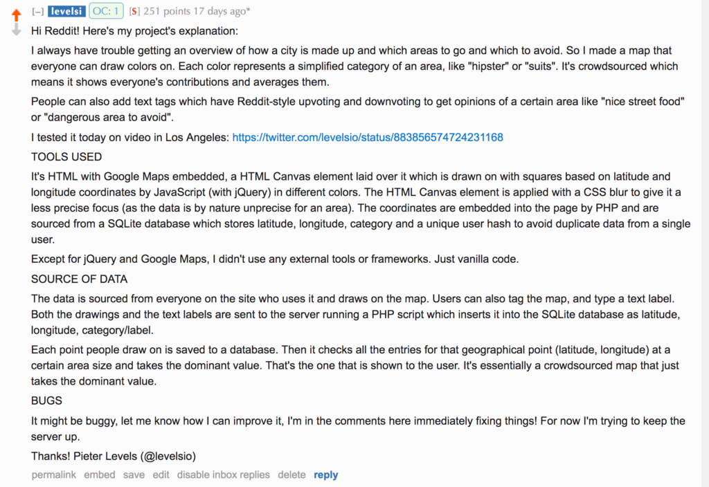 Like with Product Hunt, I jumped straight into the comments and following the guidelines of the /r/dataisbeautiful subreddit, I explained the source of the data, the process and how I built it. This took considerable effort and probably helped a lot. Again, NO SALES-y shit: