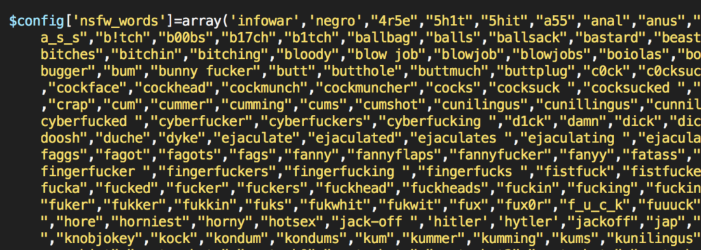 Luckily, my spam filters worked. But some racist stuff showed up. So I added this word list which instantly banned people who used them: