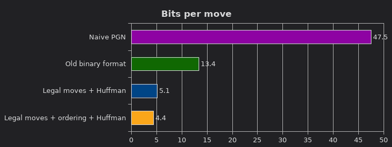 Now that we mapped the moves to a list of integer indexes we can encode them as a stream of bits, reusing Isaacly's fast bit writer from the clock time compression.