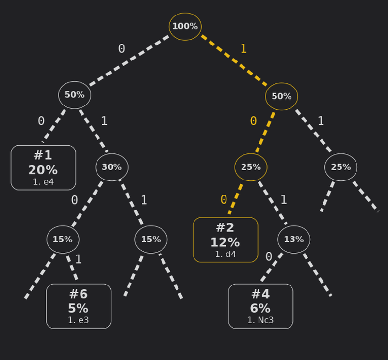 The Huffman tree: For example in the starting position 1. d4 is encoded as 100 (right, left, left).