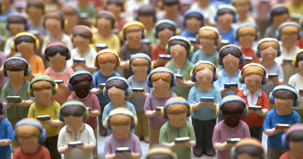 It makes connecting with strangers harder and makes feeling part of something larger impossible. Music that used to create community now often reflects existing isolation.