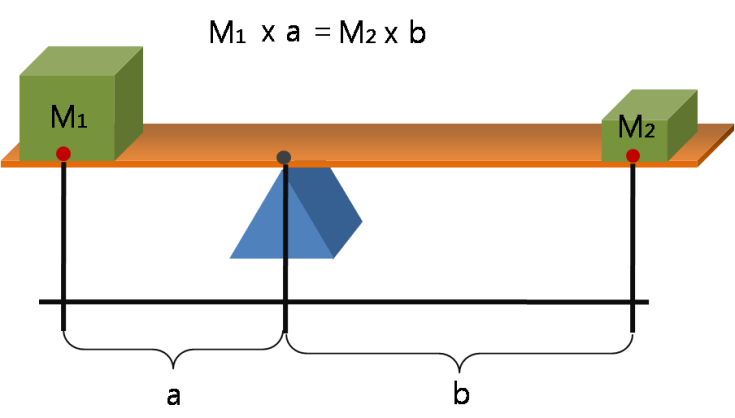 Where M is mass of each weight, while a and b are distance of each weight to the fulcrum. The resulting mechanical advantage is: M1/M2 = b/a. In the application, the weight force from this mass M1 or M2 can be replaced by input and output force.