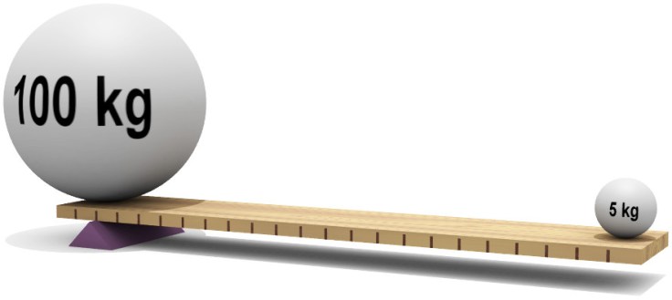 If we arrange like that, a 100 kg load on one side can be lifted by only 5 kg load on the other side. Because the 5 kg load is positioned at a larger distance from the pivot (it’s also called fulcrum). The 100 kg load on the left is positioned at 1 m distance from the fulcrum, while the 5 kg load on the right is positioned at 20 m distance from the fulcrum.