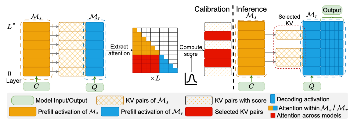 Changing the medium. Natural language is an inefficient carrier for inter-agent coordination. KVComm proposes selective sharing of Key-Value pairs instead of raw text. The method uses a layer-wise selection strategy based on attention importance scores with a Gaussian prior to identify the most informative KV pairs. Transmitting just 30% of layers’ KV pairs achieves near-full performance compared to merging complete contexts. This is a substantial reduction in the data volume moving between agents.