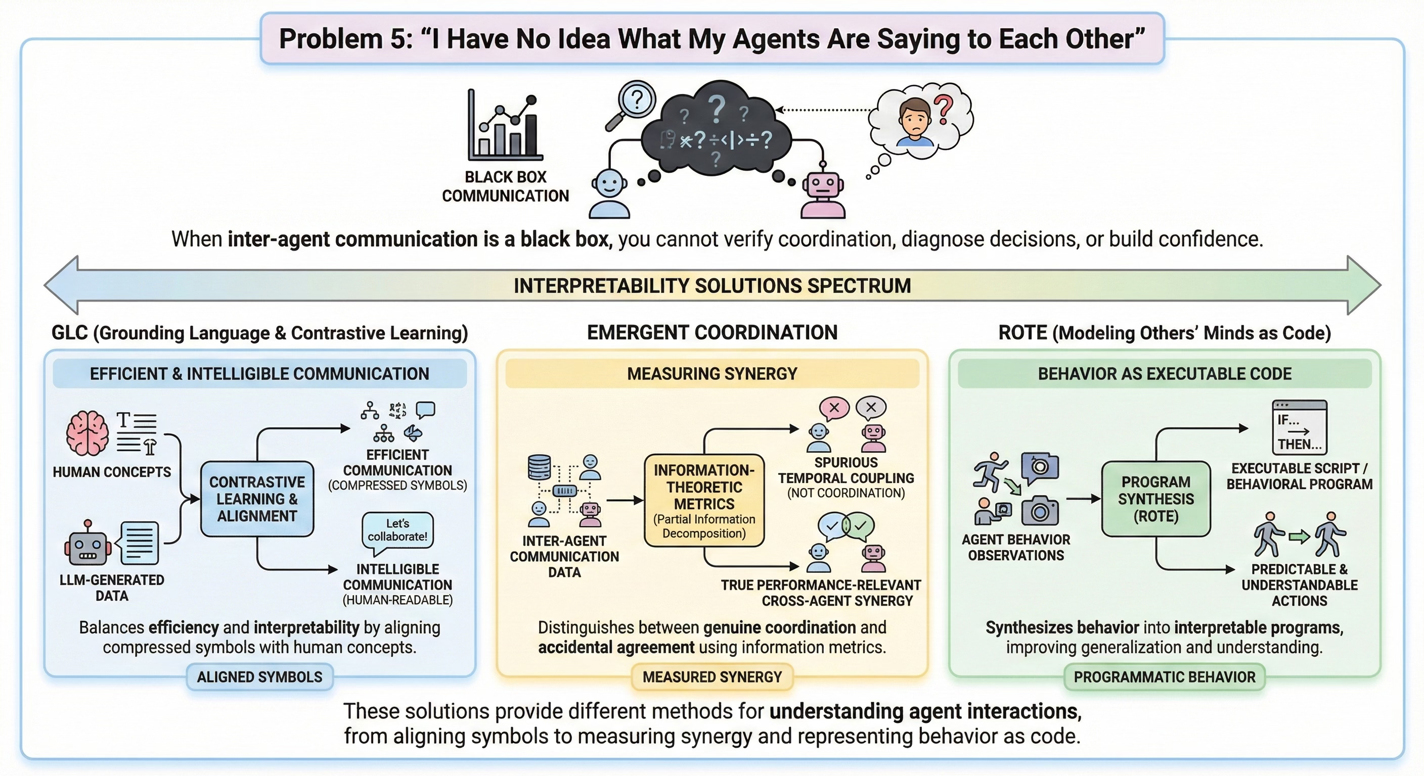 Efficiency and correctness matter, but so does understanding. When inter-agent communication is a black box, you cannot verify that coordination is actually happening, diagnose why a decision was made, or build confidence that the system will behave predictably in new situations.
