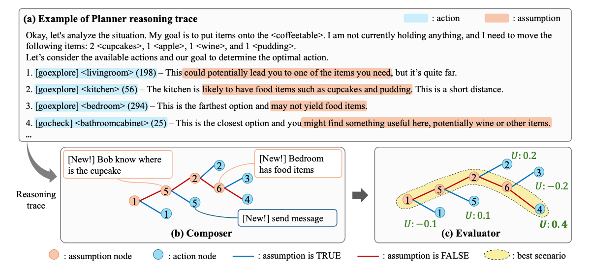 Reducing frequency. Some communication is simply unnecessary. PCE reduces the need for constant back-and-forth by converting fragmented assumptions into structured decision trees. Each path through the tree is scored by likelihood, goal-directed gain, and execution cost. This allows agents to select rational actions under uncertainty without repeatedly pinging other agents for clarification. The framework outperforms communication-heavy baselines in success rate while using fewer tokens.