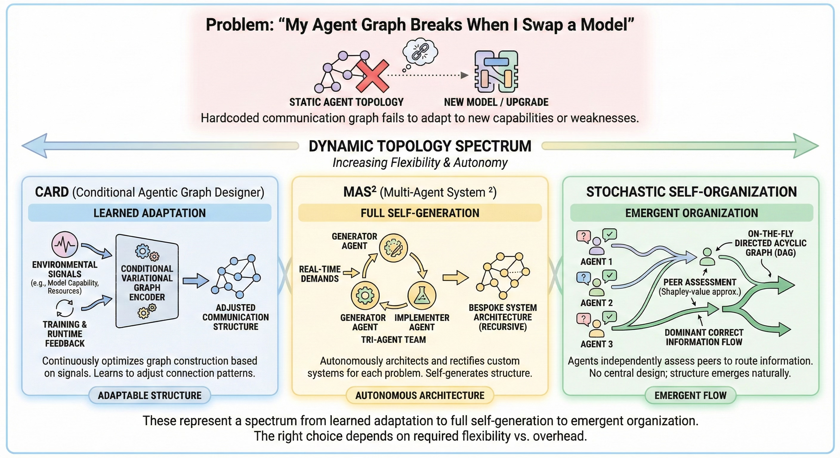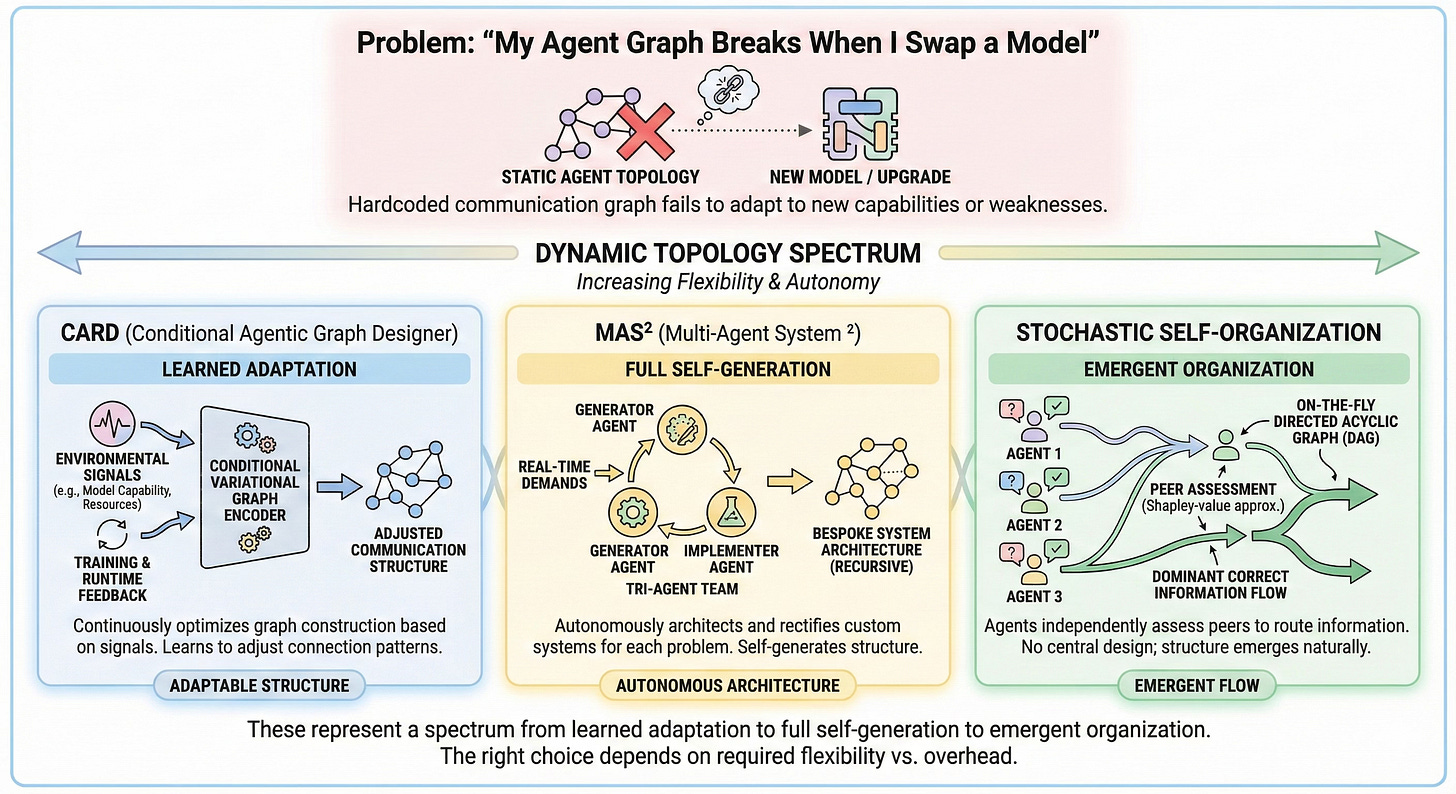 The problems above assume your agent topology is fixed and you are optimizing within it. But static topologies are themselves a source of fragility. When you upgrade a model, change an API provider, or alter a knowledge source, a hardcoded communication graph often fails to leverage new capabilities or compensate for new weaknesses.