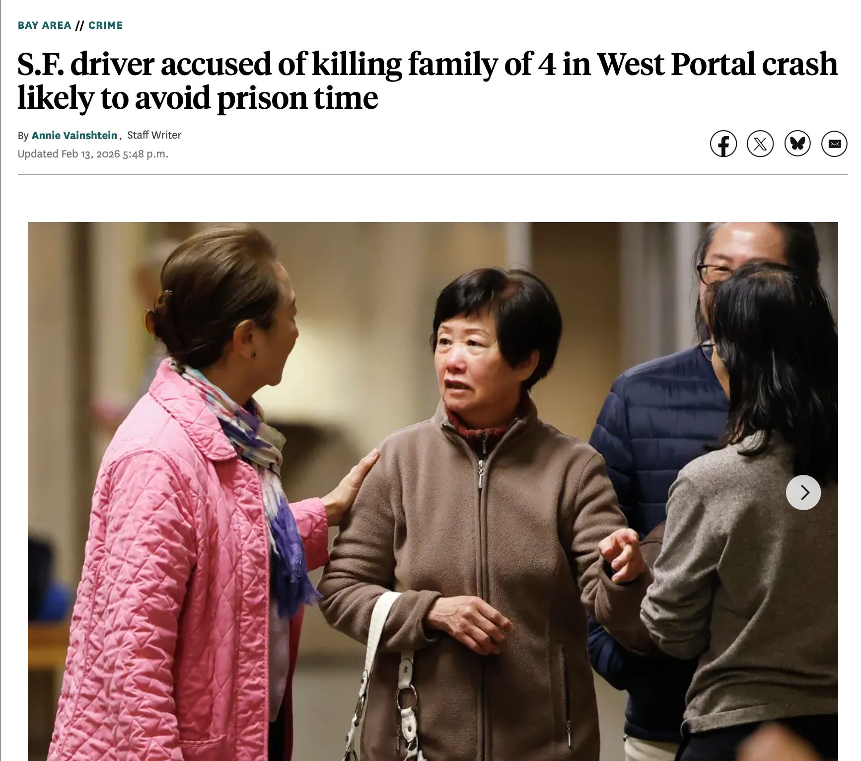 Mary Fong Lau didn’t have to drive. She is rich; She lives in San Francisco, where they have sidewalks. She could call an Uber or even a Waymo driverless car. One wonders whether she or the road design engineers should go to jail; I think the politicians who pander to drivers also bear some of the responsibility.