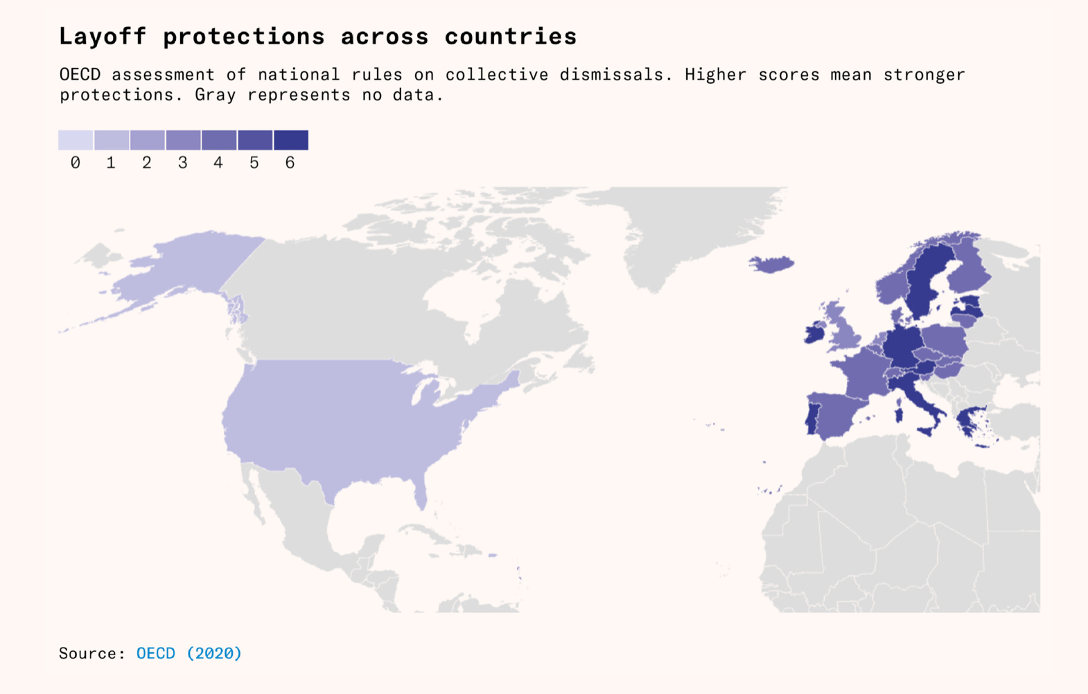 Europe’s labor laws have made it so expensive to let workers go that companies have stopped taking risks, and when companies stop taking risks they stop innovating, and when they stop innovating they fall behind. In the US, restructuring costs about 7 months of salary per employee laid off. In Germany, it’s 31. France, 38. Italy, 52. In Spain, 62 months. Over five years of salary to let one person go.