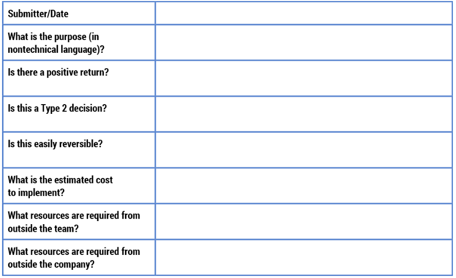 The answers to all public self-governance questions should be openly available within the company, and the architecture group should perform continuous retrospective reviews. If any issue arises, or if any of the three answers is no, the architecture group then becomes a partner, helping to generate a business case and thoroughly work through the proposal. This proactive approach allows other teams without issues to move forward with no delays.