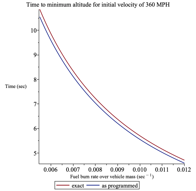 The rocket equation is what gives rise to the suicide burn being optimal, and the five terms he uses of the Taylor series, where the argument is at most 0.1212, makes it accurate to over six decimal places. So that’s not the problem we’re looking for.