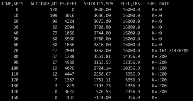 Because the mass is changing over the timestep, the acceleration will change too, so assuming it’s constant is only approximate. But surprisingly, Jim used the exact solution, the Tsiolkovsky rocket equation, with a Taylor series expansion for the logarithm. He also used some algebra to simplify it and reduce the amount of round off error. Very impressive for a high school senior in 1969. When I asked him about it: