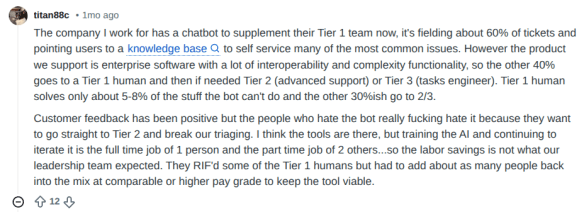 There are more anecdotes like this. You can go on Reddit and look for how the customer support is surviving in these tough AGI times. This is a common theme: