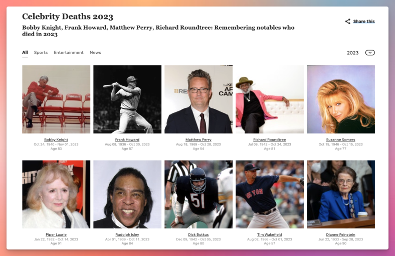 USAToday has pages that list celebrity deaths each year, including an ongoing list for 2023.