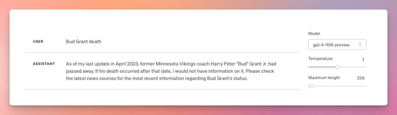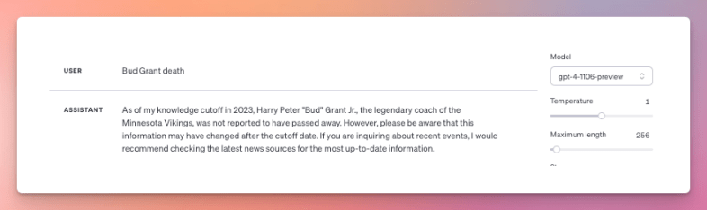 For others, ChatGPT will sometimes say the person is still alive, other times that he or she passed away. For example, Bud Grant, a former Minnesota Vikings coach, died on March 11, 2023 so in theory should be part of GPT-4 Turbo’s knowledge. However, sometimes the API returns a correct death date for him in the script, but often not. Ditto if you ask the playground about him. Here it responds he’s still alive: