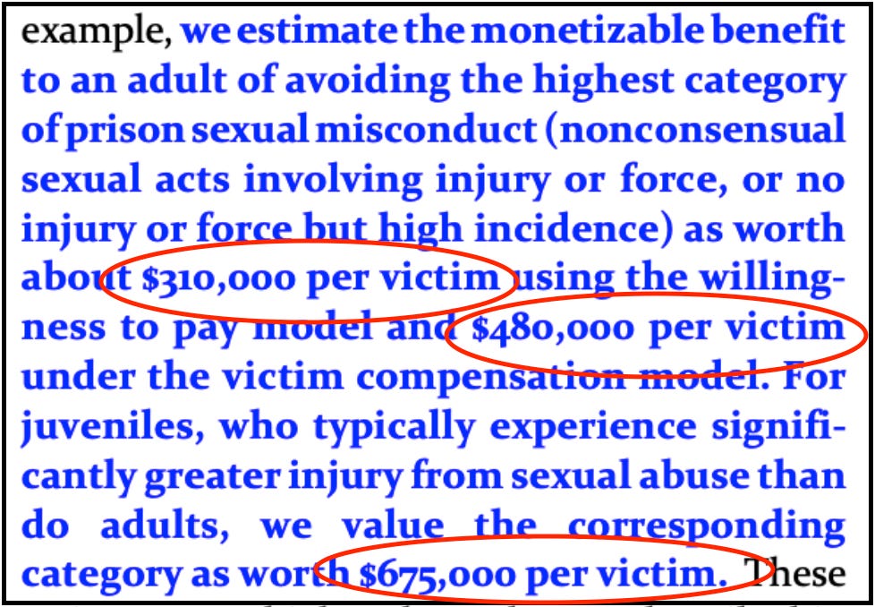 The Regulatory Impact Assessment is here, if you want to to go through the cost/benefit analysis of prison-based sexual assault. Or you can just read a key paragraph, which details the amount it is ‘worth’ per victim.
