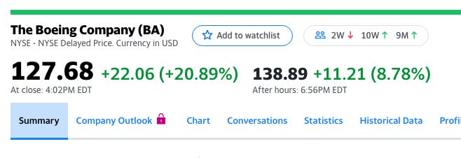 While there isn’t a direct statement ‘we are handing a gift out to XYZ,’ legislative graft doesn’t work that way. The bill is authorization to restructure the economy according to the preferences of a very small group of people. Or to make it simpler, here’s what happened to Boeing’s stock price yesterday.