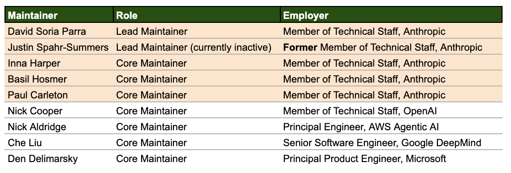 Over time, MCP formalized its governance, with maintainers that spanned a number of major companies: