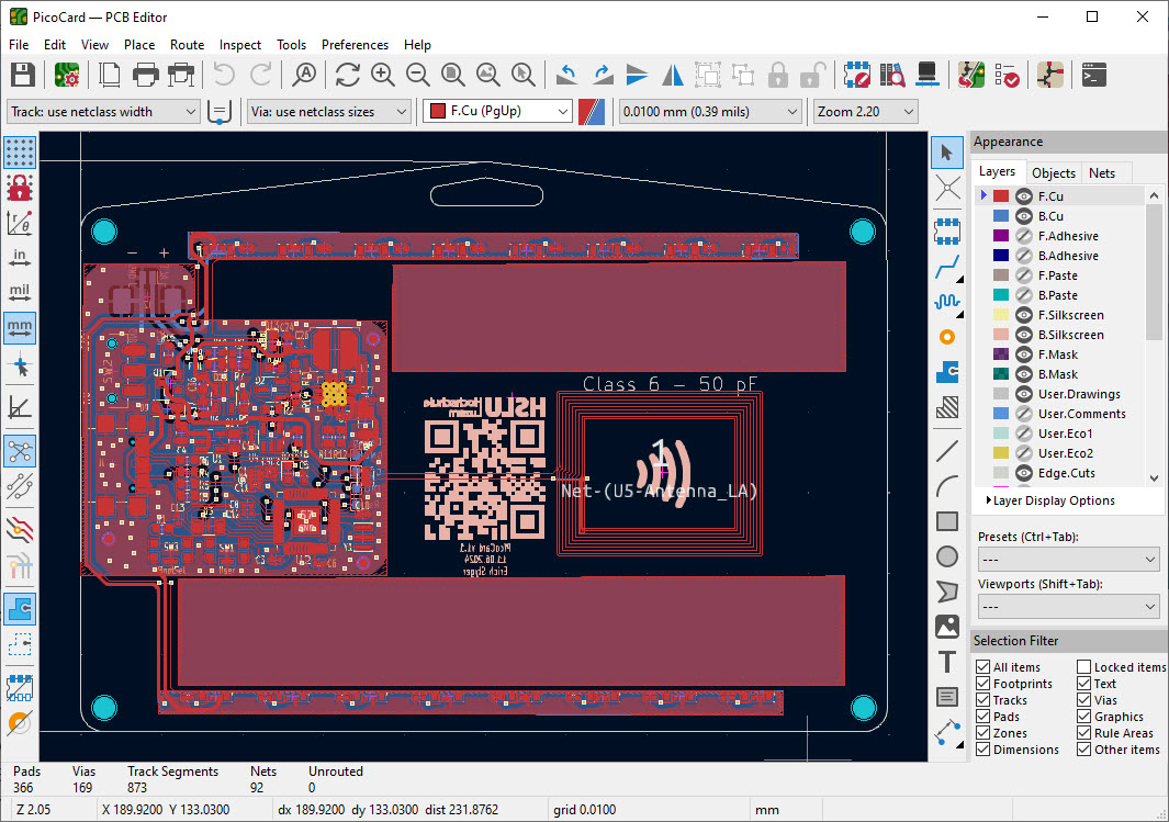 💡 Ideally the area around the RFID antenna would a full keep-out area, but with the tuned antenna it works very well with smart phone RFID reader and writers, plus it even works with an additional RFID card place on top or back of it.