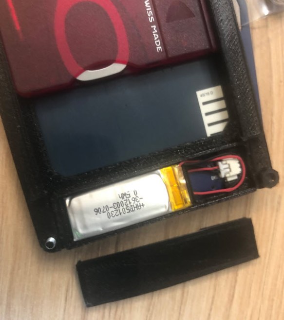 An optional rechargeable battery can be connected and placed on the back side. Below a 85 mA LiPo battery inside the 3D printed compartment on the back: