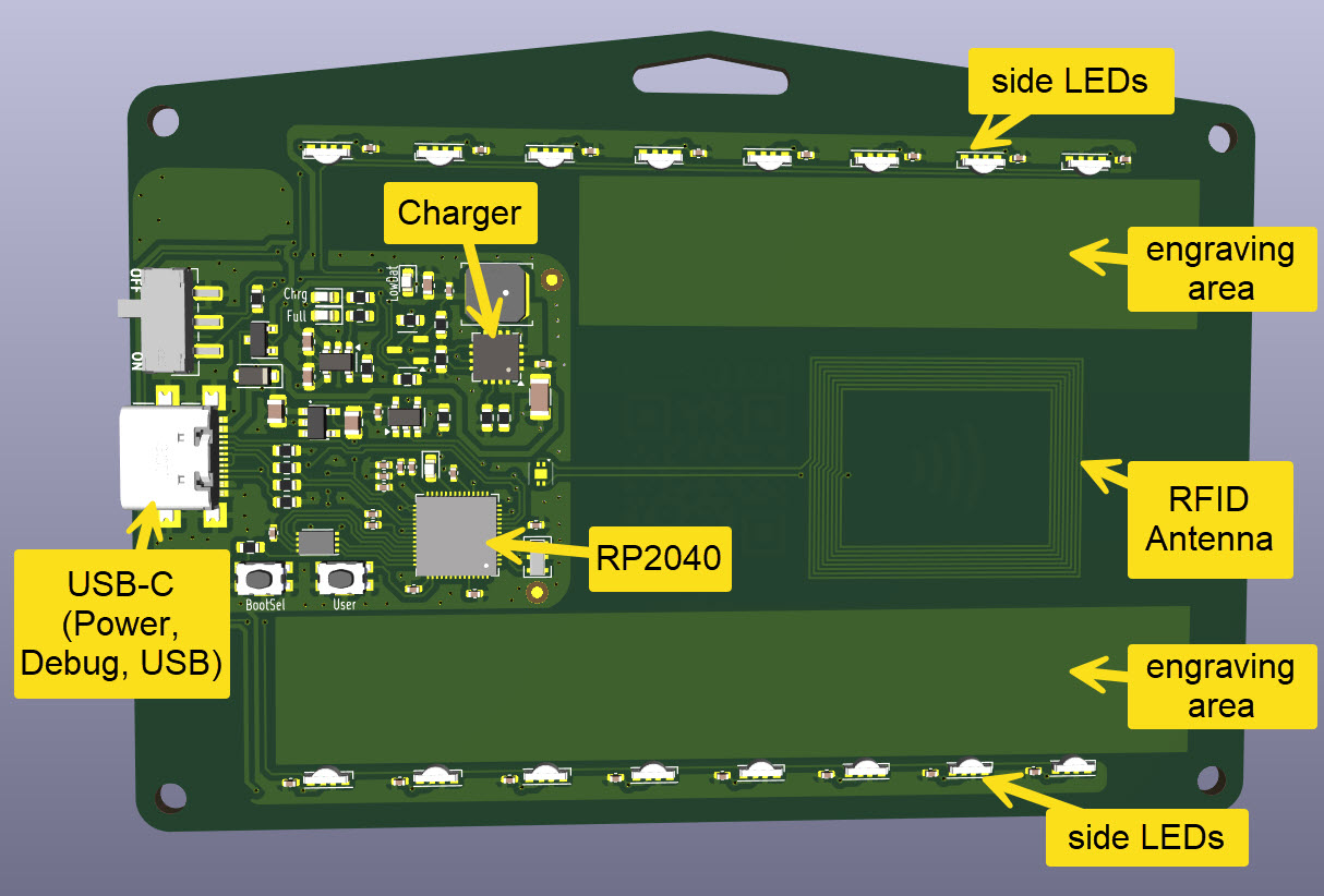 I’m really happy with the result of this project which has evolved over the last two months. I have a 0.8mm PCB business card with RFID to hold my contact information. The business card includes the NXP NTAG213 RFID IC and can be customized with a laser engraver. The circuit includes the hack-able RP2040 micro-controller, a battery charging circuit and up to 16 addressable LEDs to create a light show for the badge or for a desktop acrylic light-up sign.