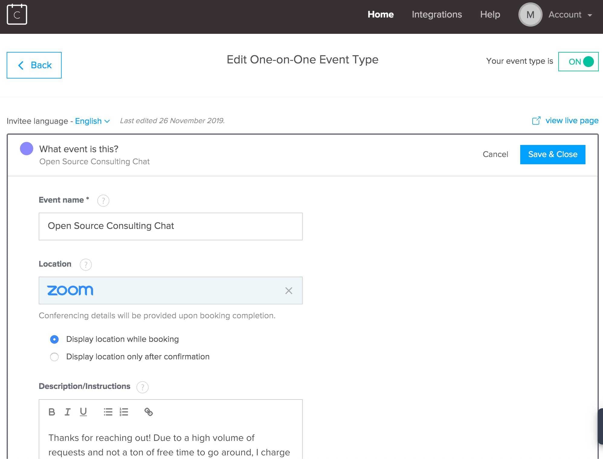 Create a new one-on-one event type in Calendly (I called mine "Open Source Consulting Chat"). Set the location to Zoom so that you'll automatically get a video hangout invite with the participant.