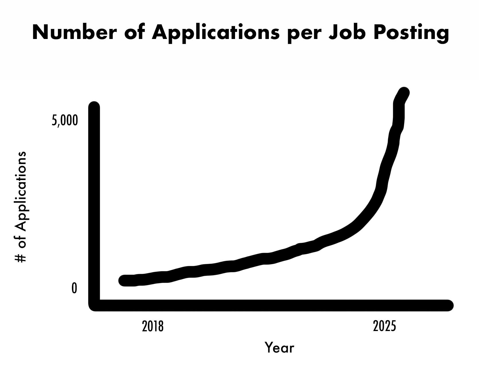 I’m at a company that hires software engineers. We are getting thousands (thousands!) of applications daily for each role. It didn’t used to be like this. Here’s a highly scientific graph of the average number of job applications for a single software role: