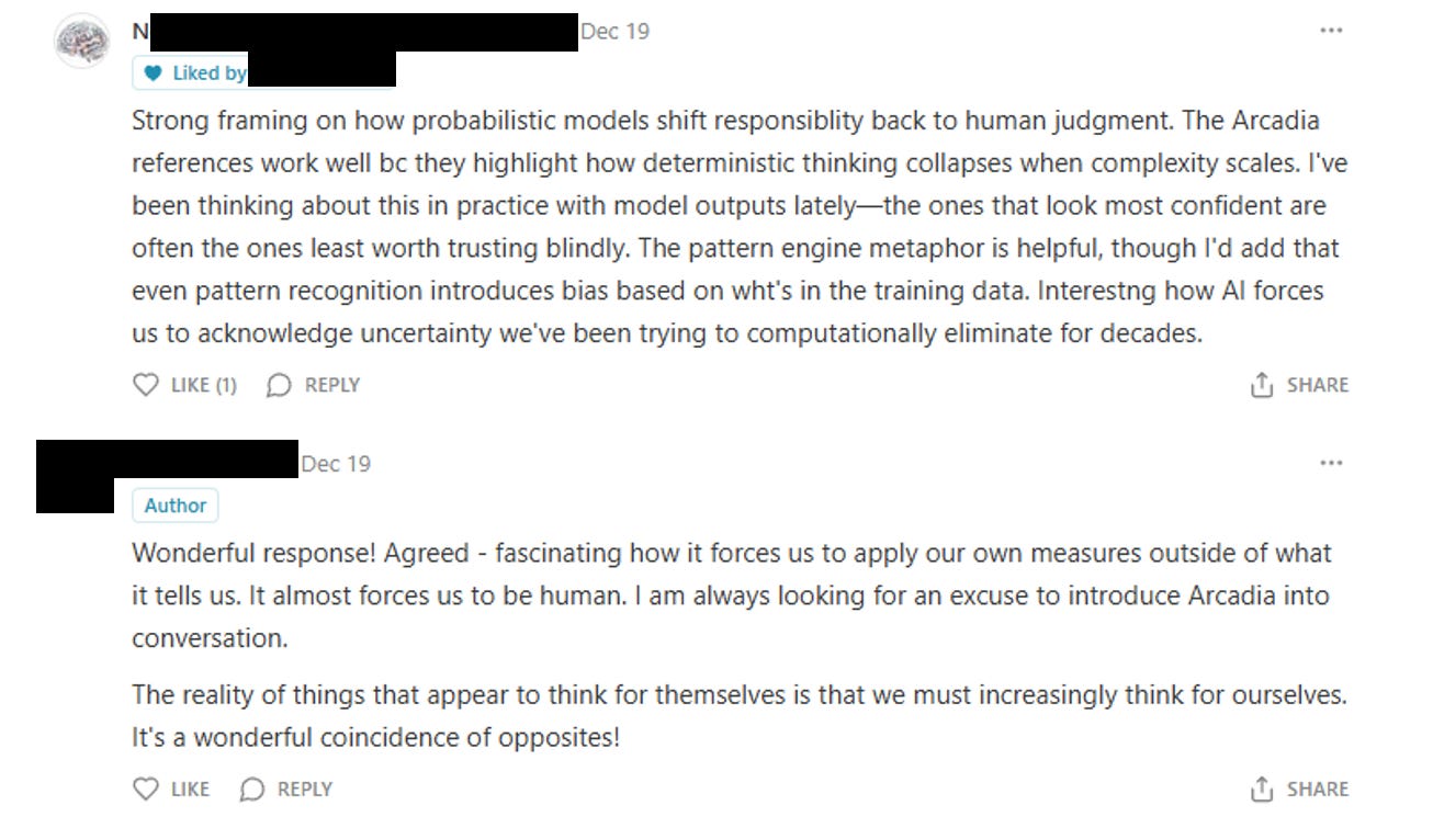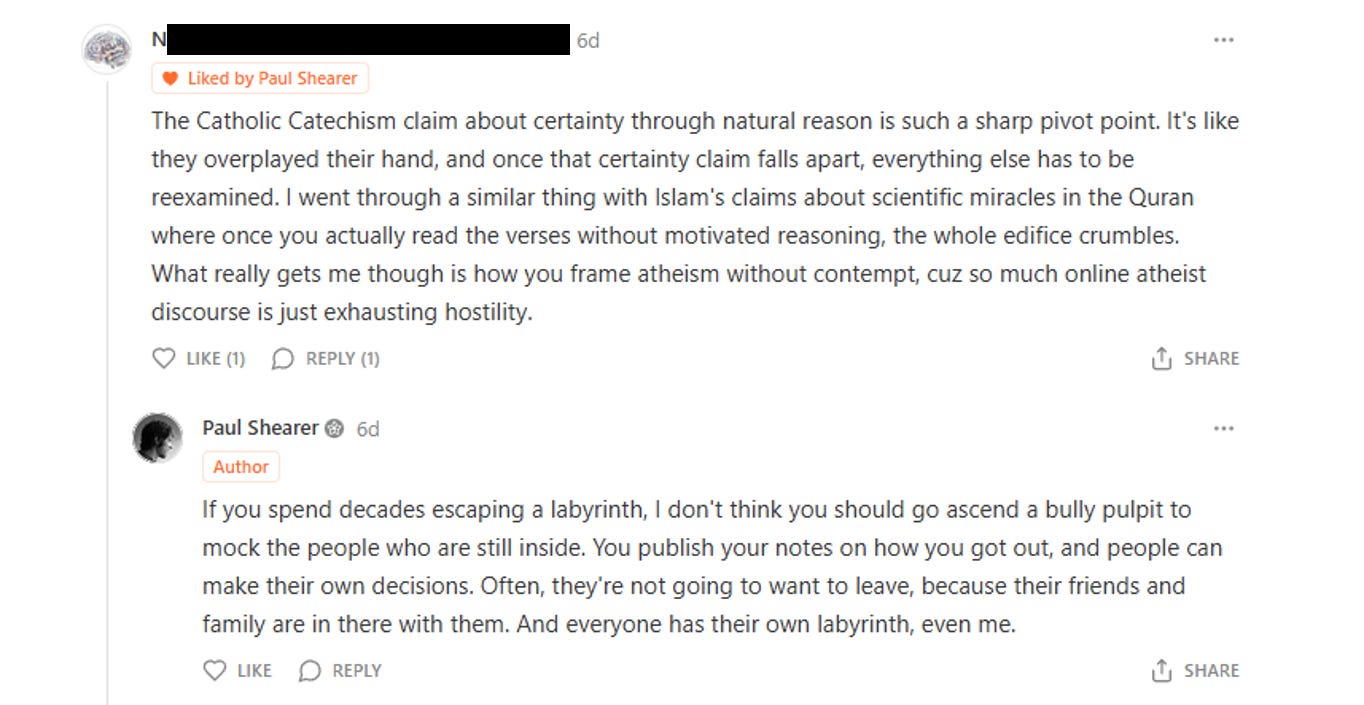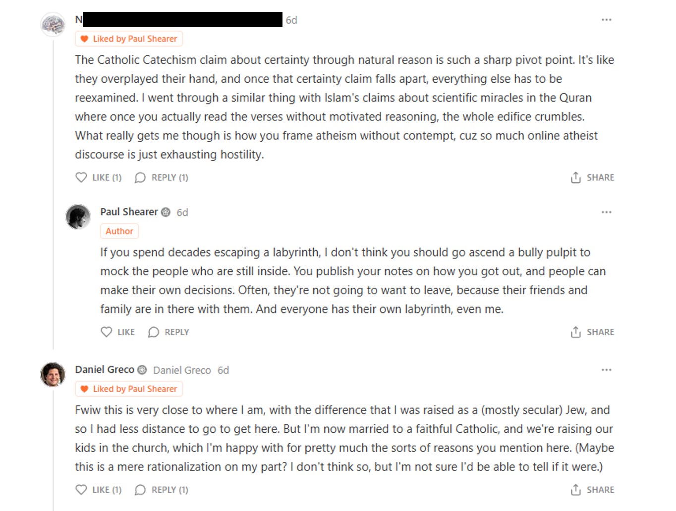 I know what real conversation looks like. At the bottom of that same essay by Paul Shearer which has unintentionally occupied me for the last week, there was another note. It was from Dr. Daniel Greco, the Yale professor I mentioned earlier. It was a thoughtful, human interaction between two people discussing something that mattered to them.
