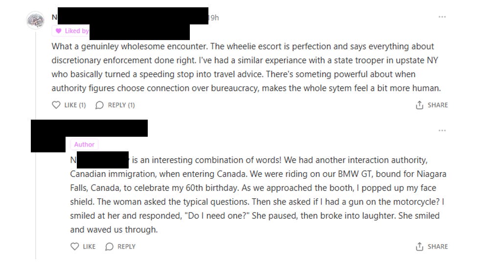 This account is offering the false promise of human conversation, then delivering it by running a script. They are socially engineering people who are just trying to converse about subjects that matter to them – tricking them into thinking that the Substack algorithm is working for them. A bigger account found their article, took the time to read it, and left them a kind note.