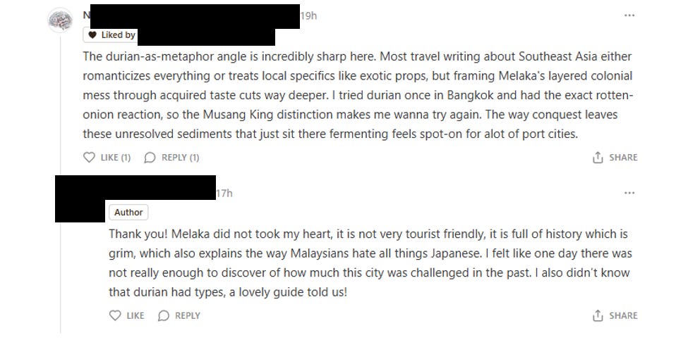 I do believe this account is violating Substack’s terms of service1, so I reported them to Substack, provided evidence and asked them to investigate. I will update this post if and when they respond. I spent days debating whether to name the account directly in this post, but dispositionally I prefer a silent exile to a public hanging. It’s a part of my humanity that I would like to keep. I do recognize that both options are better than letting someone exploit the people of your town, so if exile does not work, I will re-evaluate this decision.