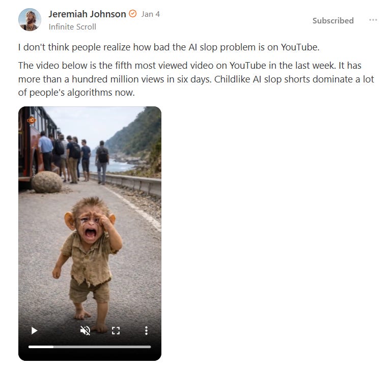 Facebook has become a wasteland of AI slop. Many of the top trending videos on YouTube are AI, like this galling abomination brought to light by the horrified Jeremiah Johnson: