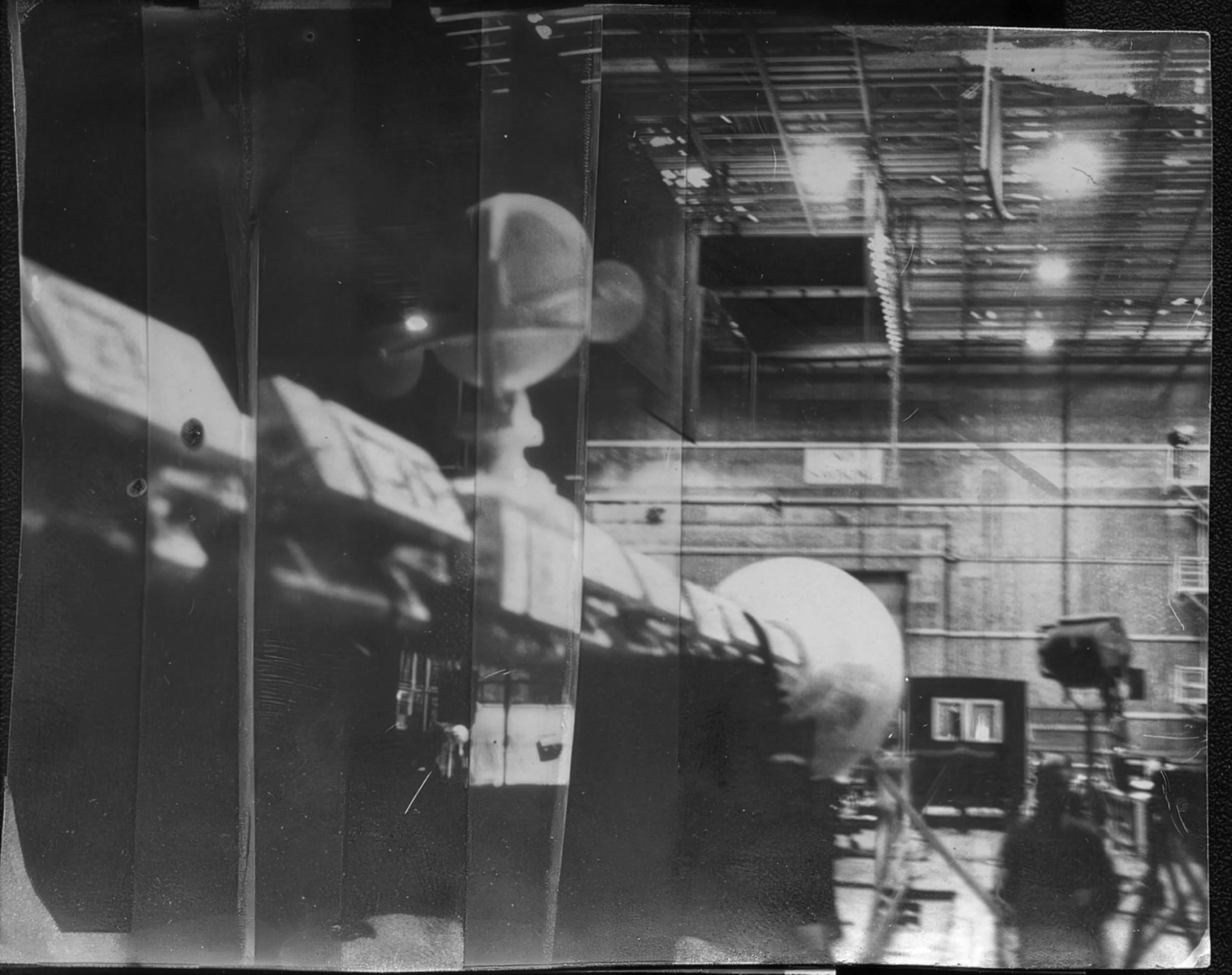 Unlike previous, more primitive versions of in-camera visual effects, this electromechanical system enabled consistent, repeatable motions between takes. This was essential for the multiple passes needed to expose different parts of the film frame—incorporating separate exposures, for example, for the ship’s illuminated body and tiny scenes of interiors projected onto its windows. The system also had specific limitations. As revealed during the use of Selsyn motors in military control systems, the accuracy of a synchronized, analog motor-control system declines with increasing degrees of motion. As a result, Kubrick and Trumbull agreed on a simple, linear trajectory for the Discovery, produced by driving the camera motion on a long, straight track set obliquely to the giant model, propelled by a twenty-foot drive gear machined in Detroit and airfreighted to the set. Reporting on 2001’s technical innovations, American Cinematographer would term the result “The Mechanical Monster with the Delicate Touch” (Lightman 1968).