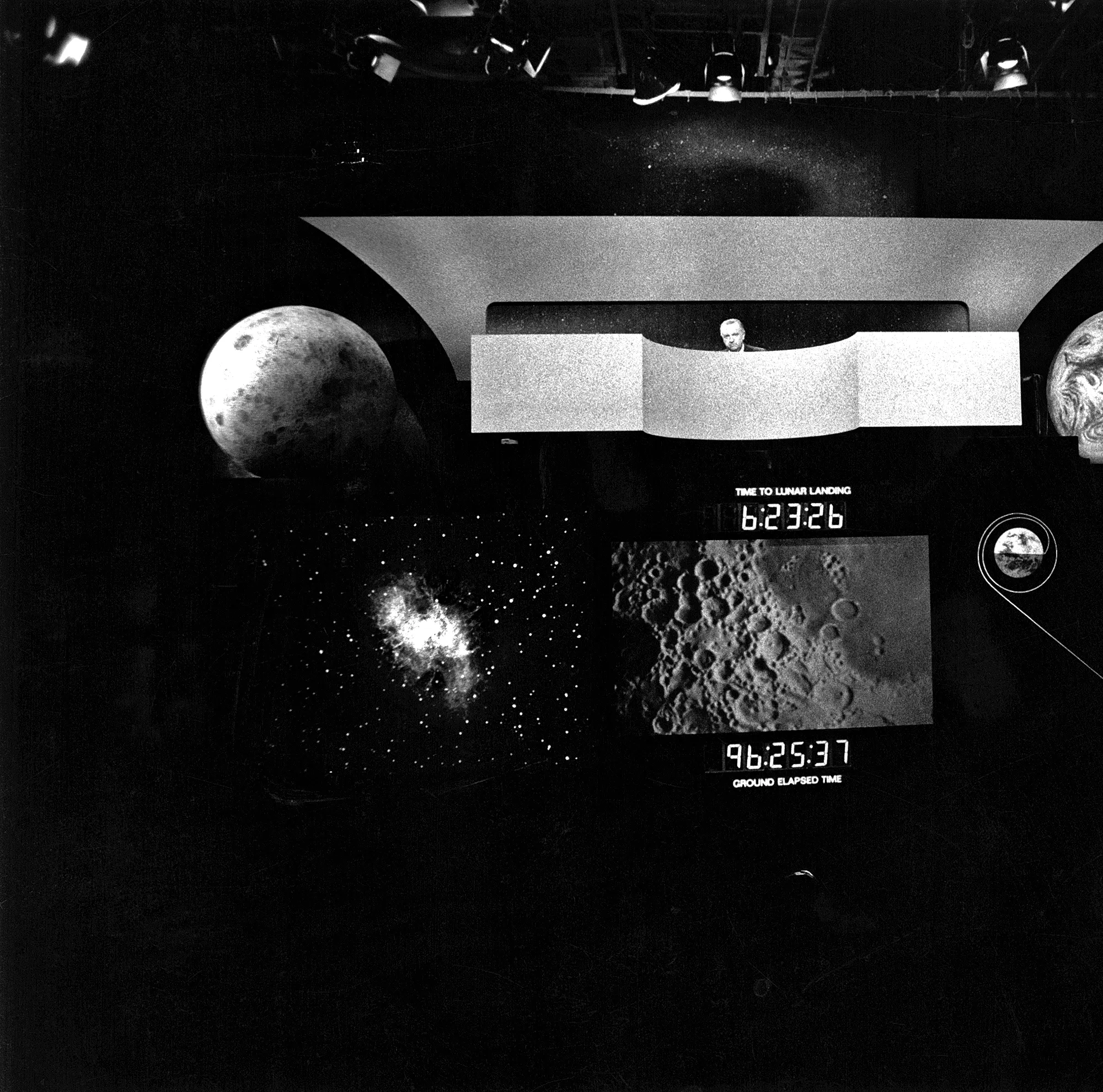 And our circles grow together. On the CBS soundstage, venerable host Walter Cronkite presented from a special set designed by Douglas Trumbull; the CBS staff nicknamed the complex and mercurial set piece “HAL 10000” as a presumed sequel to 2001’s psychopathic AI, HAL 9000. The set’s screens and surfaces featured displays and simulation that reflected the elaborate training for the mission as well as the unexpected realities of the landings’ broadcast. These screens would be full of images that drew on Apollo’s intensive use of simulations.