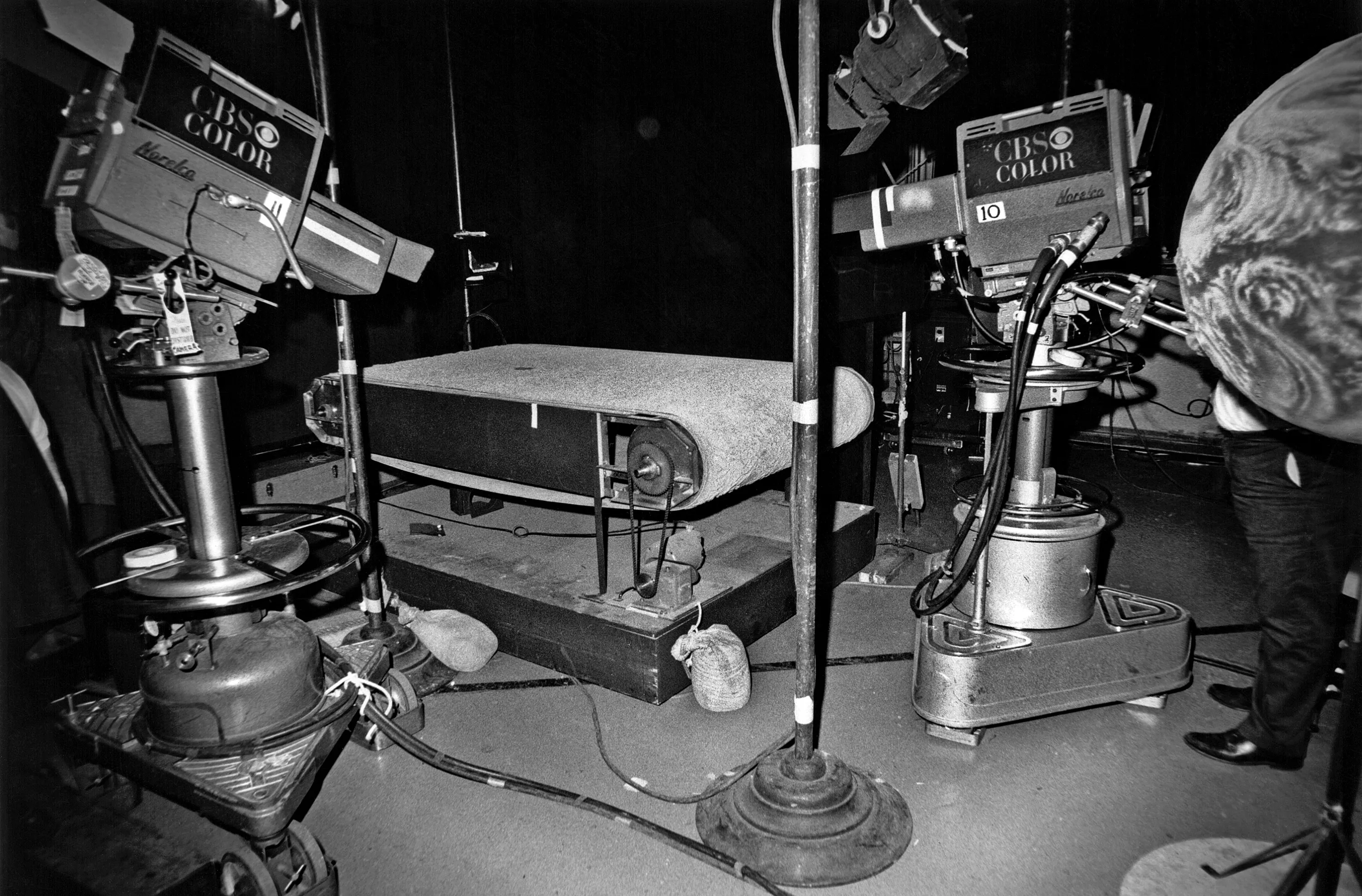 Which brings us back to HAL 10000 and the CBS lunar stage set. In the same month when Walter Cronkite’s evening news had recently expanded from fifteen to thirty minutes, the thirty-one-hour Apollo 11 broadcast was an extended visual feast—with a healthy serving of simulation. This included views of actors in space suit costumes on a stage set at LEM manufacturer Grumman in Bethpage, Long Island, with mining slag standing in for the lunar surface. Broadcast views also combined transparencies and mechanisms sourced from NASA contractors with new techniques in noise reduction and chromakey (“greenscreen”) technology for live broadcast. A prime example was the view broadcast as the Eagle capsule descended to the moon’s surface, which combined a transparency of the rising earth, another of a hovering lunar lander, and a scrolling, latex-belt lunar surface—all under the prominent caption “CBS NEWS SIMULATION.”